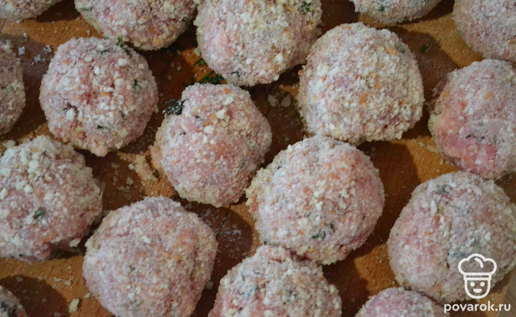 Из фарша с сухарями формируем шарики. Обваливаем получившиеся шарики в оставшихся сухарях. Обжариваем на хорошо разогретой сковороде с маслом в течение 10-15 секунд с каждой стороны.