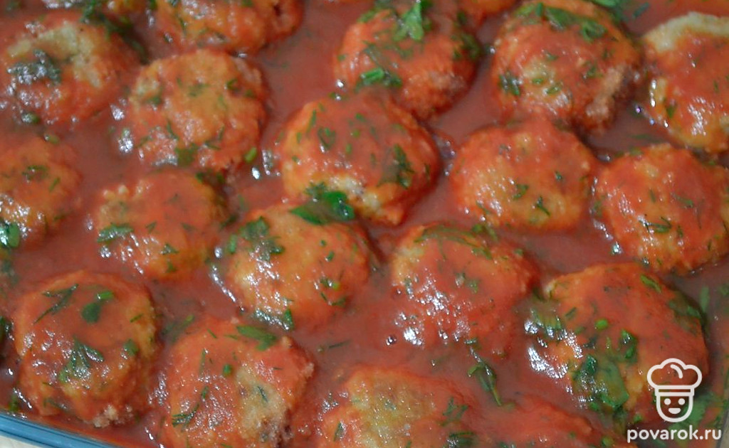 Помещаем фрикадельки в форму для запекания и заливаем соусом. Соус должен практически полностью покрывать фрикадельки. При необходимости добавляем еще немного воды. Ставим в духовку на 45-55 минут при температуре 180 градусов.