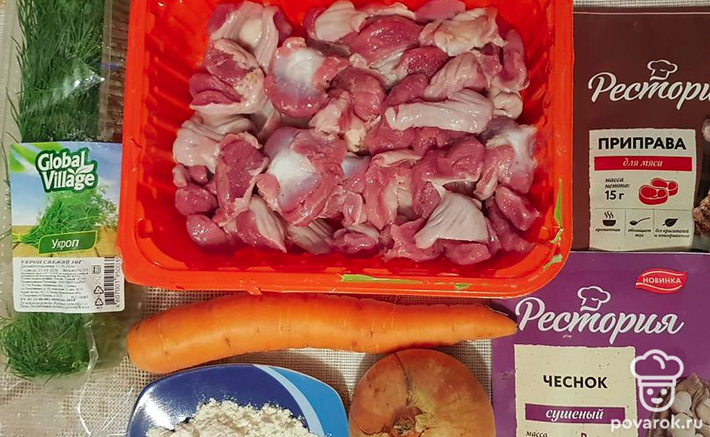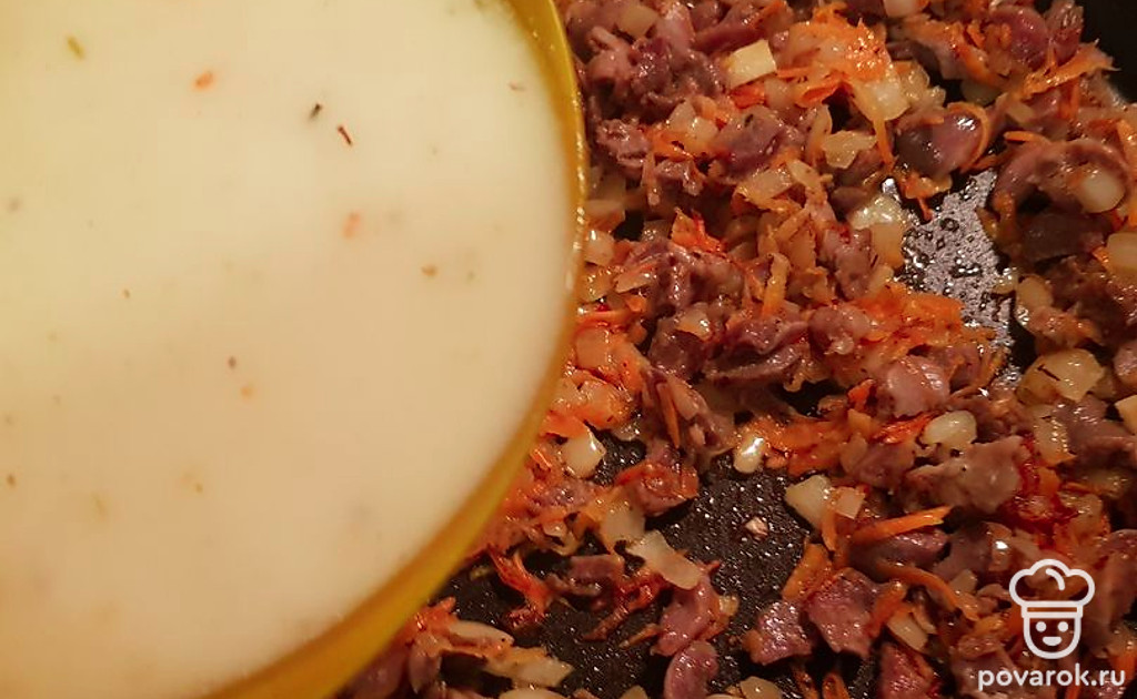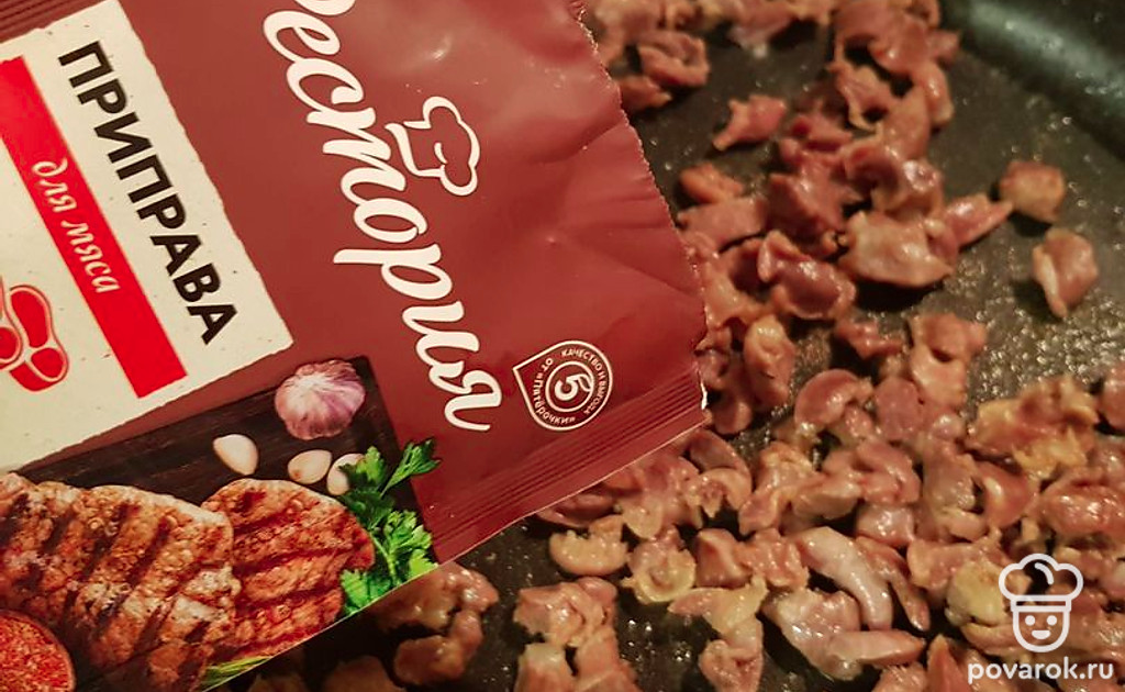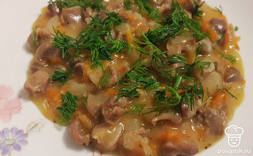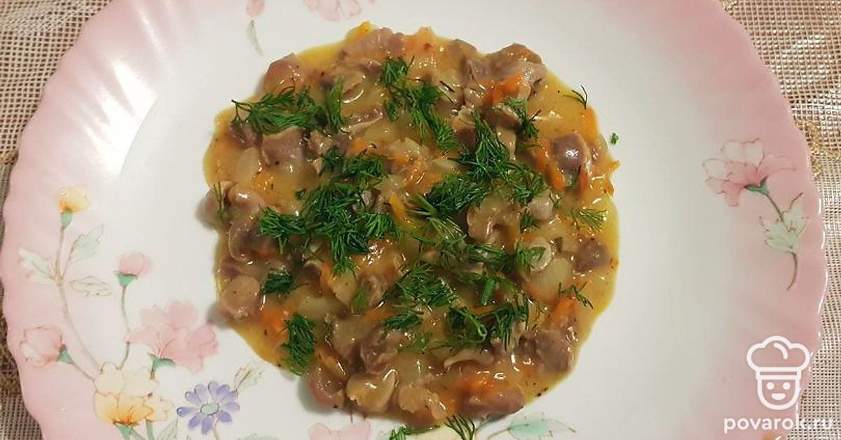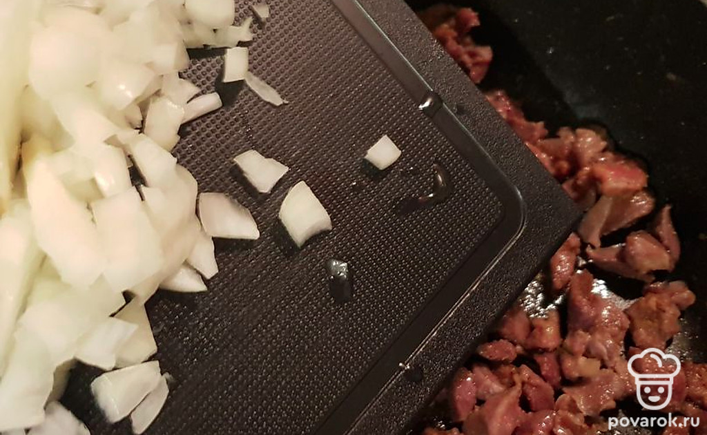 Лук почистите и нарежьте кубиком, добавьте к желудкам. Готовьте 5 минут.