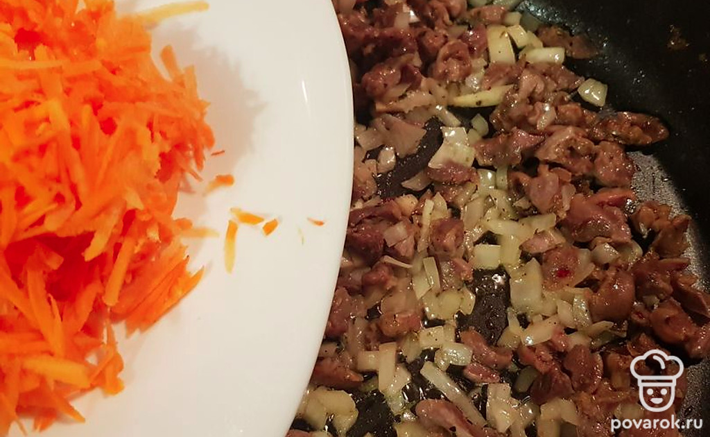 Морковь почистите и натрите на терке. Отправьте на сковороду, готовьте 3 минуты.