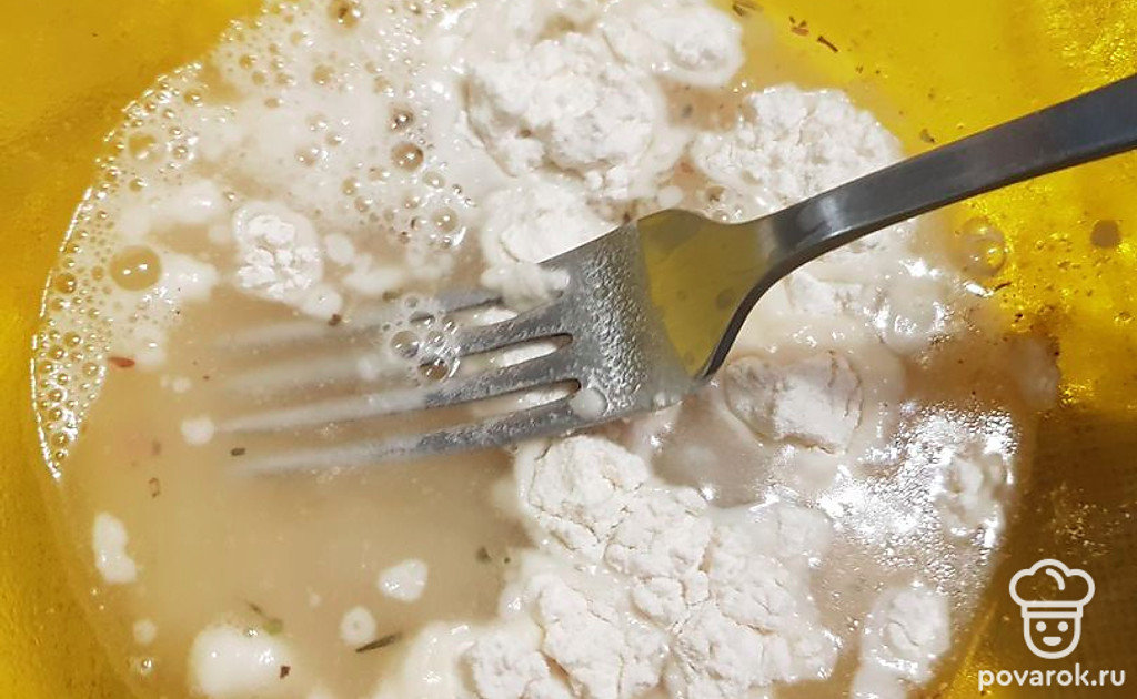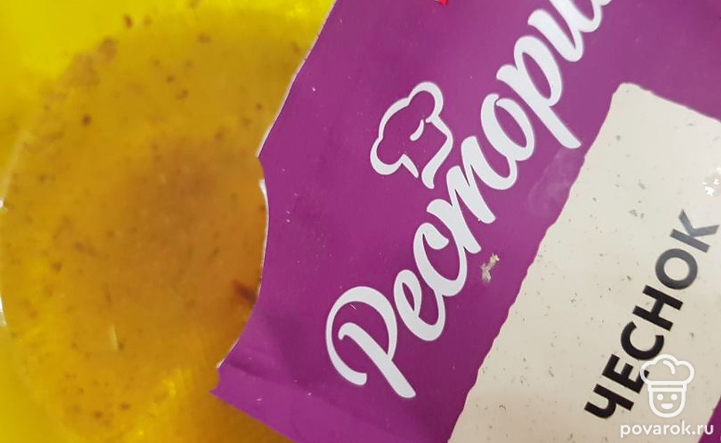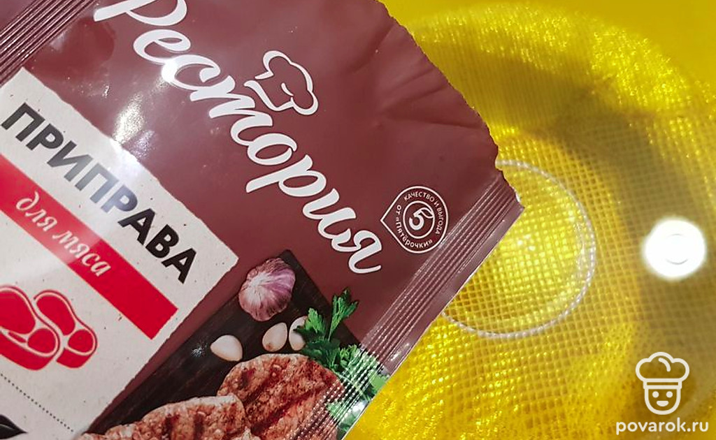 Сделайте смесь для подливы. В глубокую тарелку налейте 1 стакан теплой воды. Всыпьте приправу для мяса.