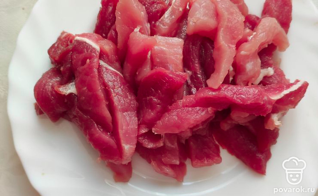 Нарежьте свиную мякоть соломкой толщиной менее 1 сантиметра и длиной 5-7 сантиметров.