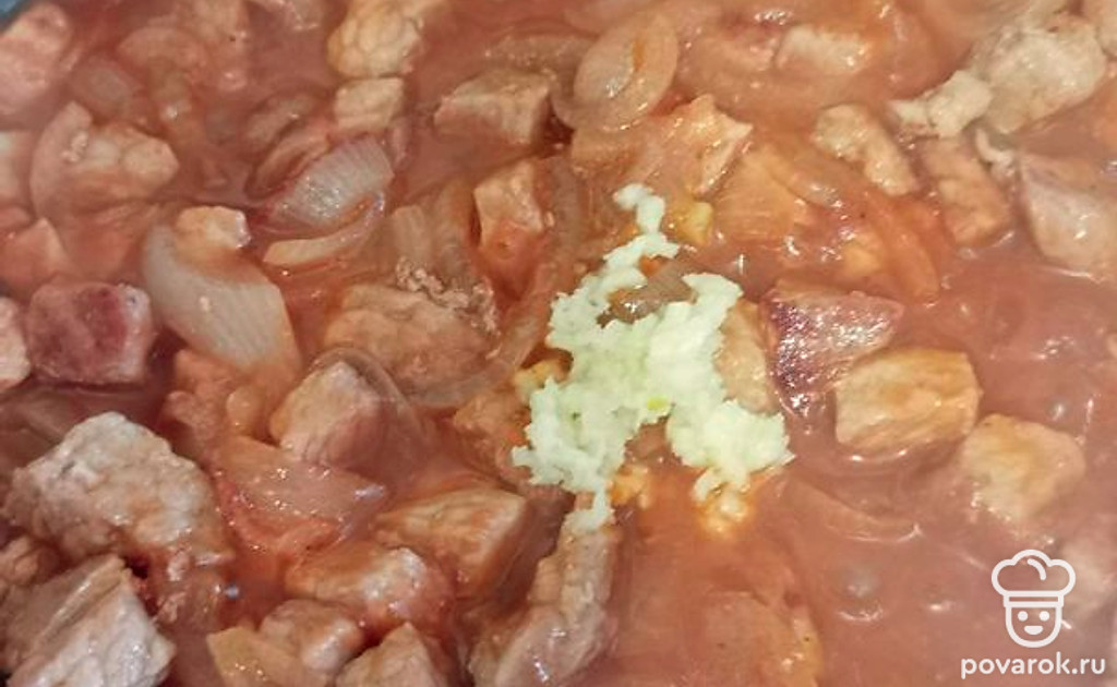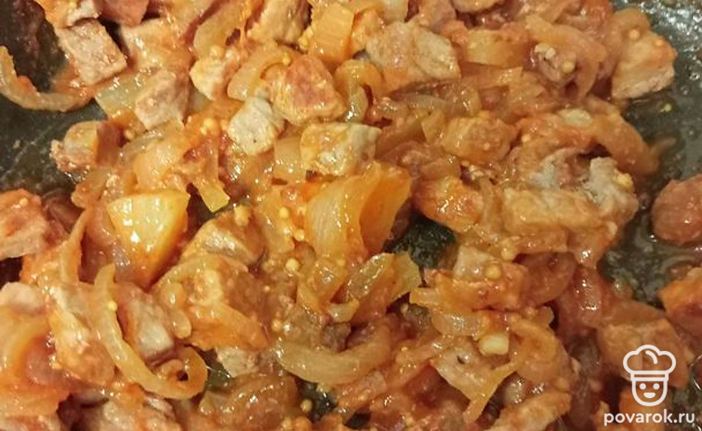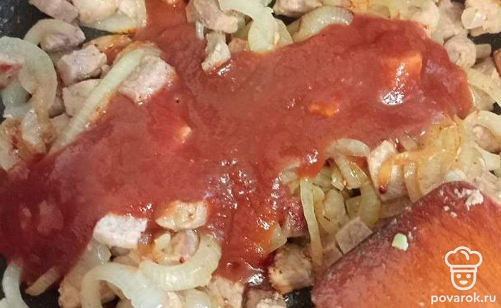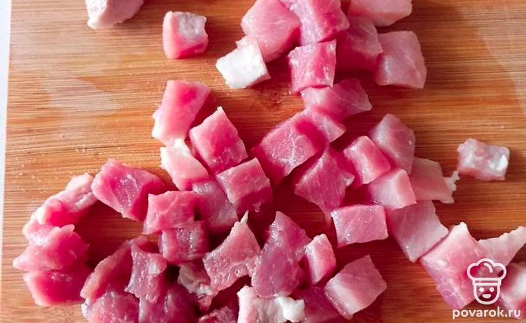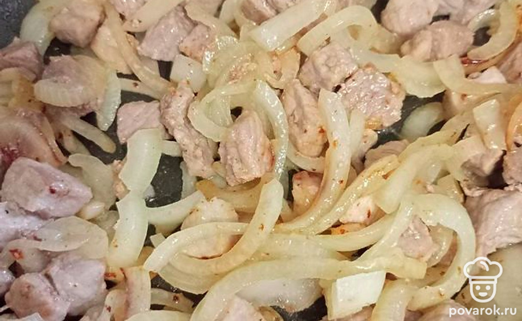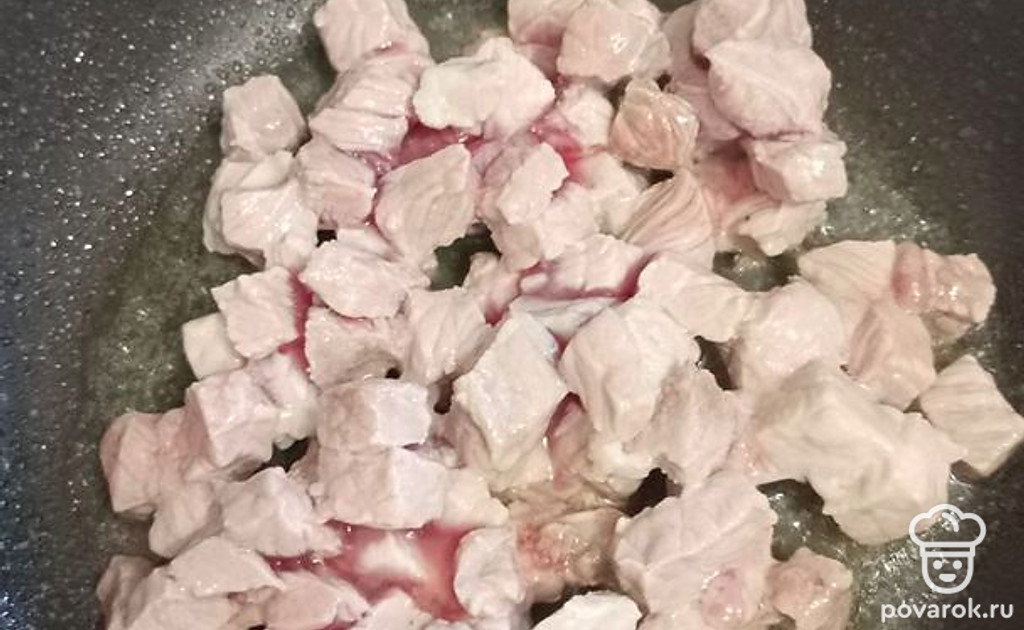 Кубики мяса выложите на сковороду. Должна появиться белая корочка.