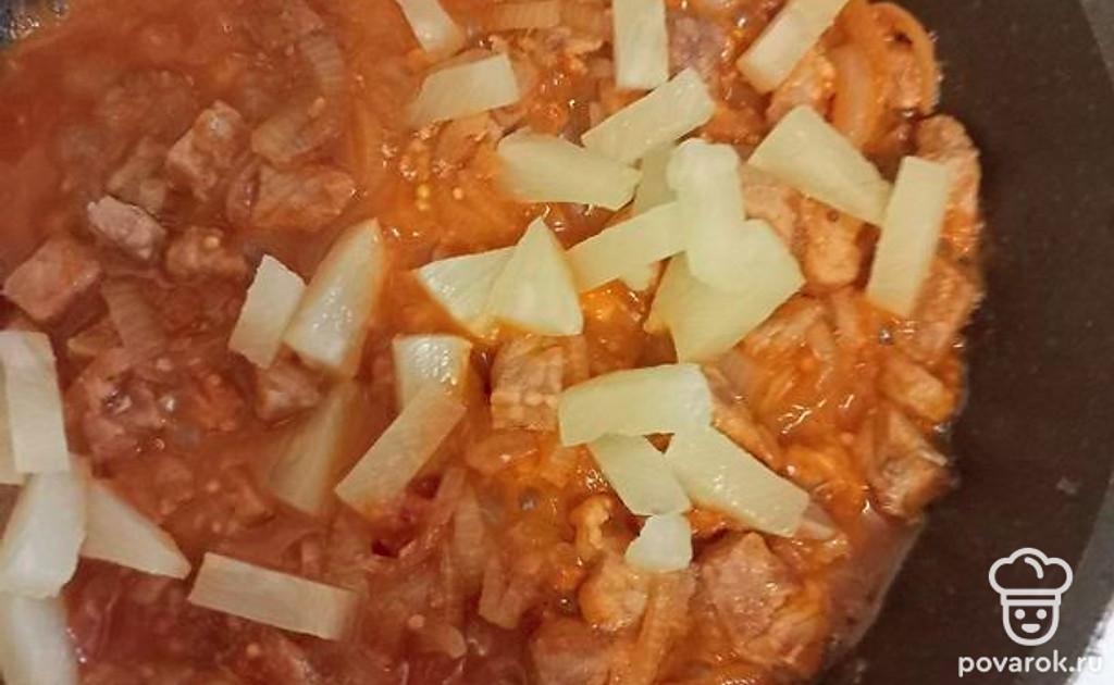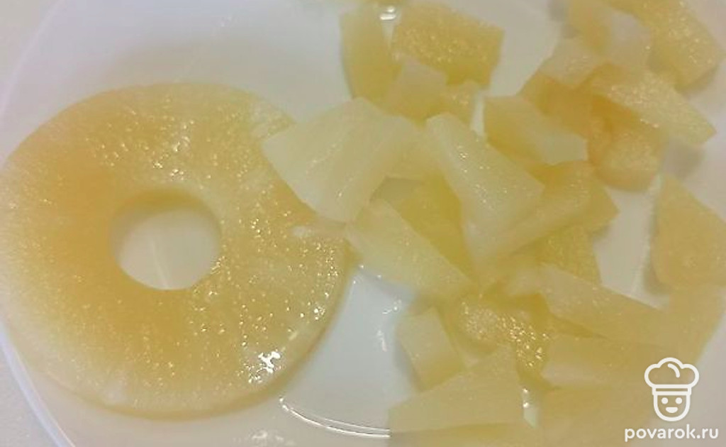 Выложите в сковороду ананас. Накройте крышкой и тушите 10 минут.