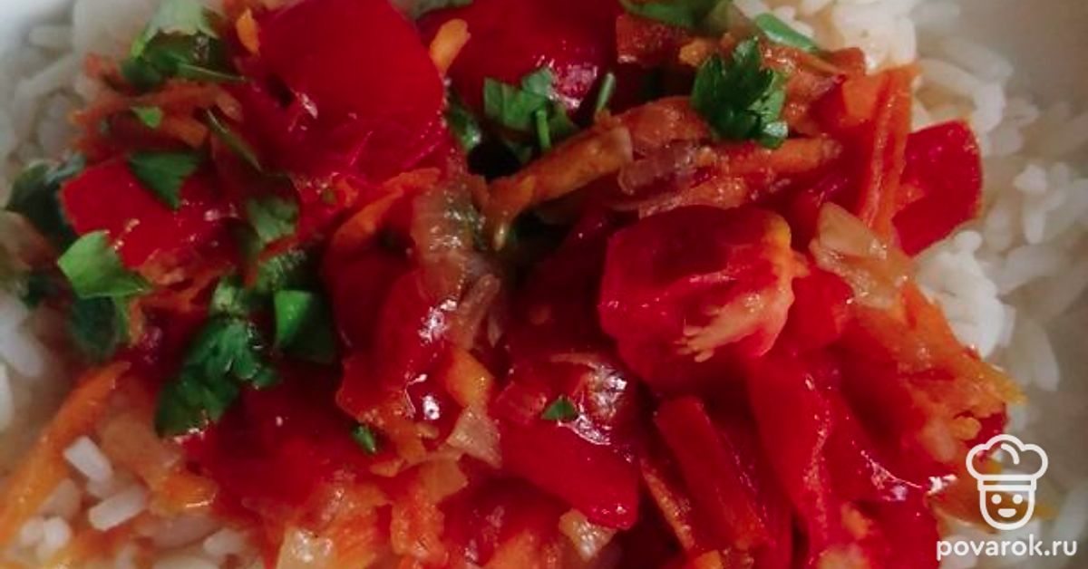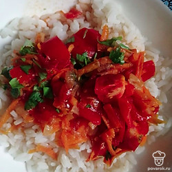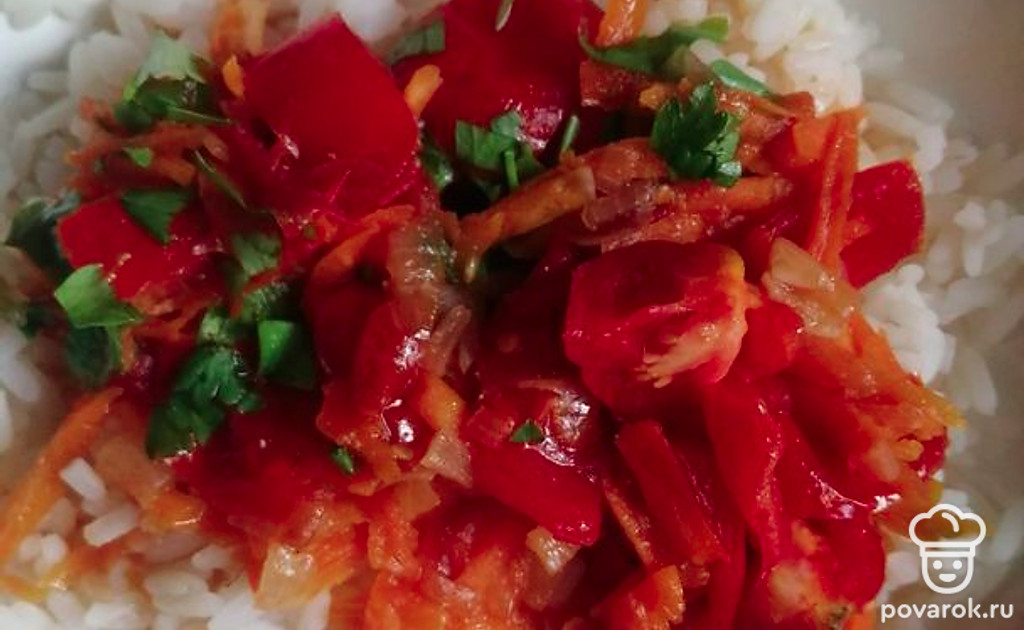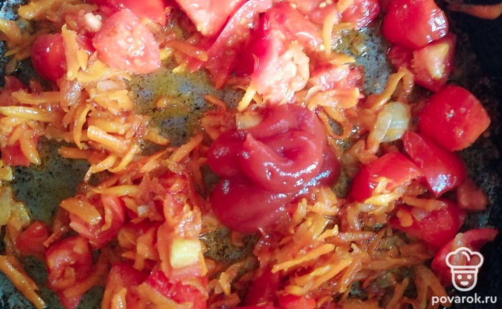 Лук нарезать кубиком, морковь натереть на терке. Обжарить лук до золотистого цвета, добавить морковь и жарить еще 10 минут. Потом добавить помидоры, нарезанные кубиком, и обжарить еще 7 минут. Добавить томатную пасту или кетчуп. Перемешать.
