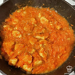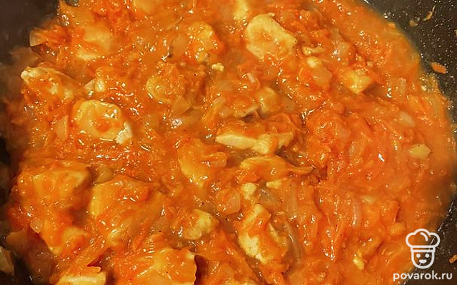 Добавляем к грудке морковь и лук, обжариваем 10 минут.