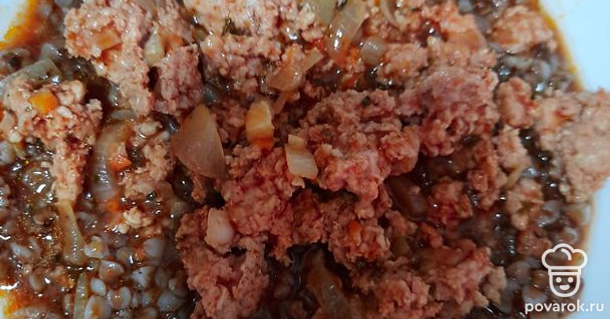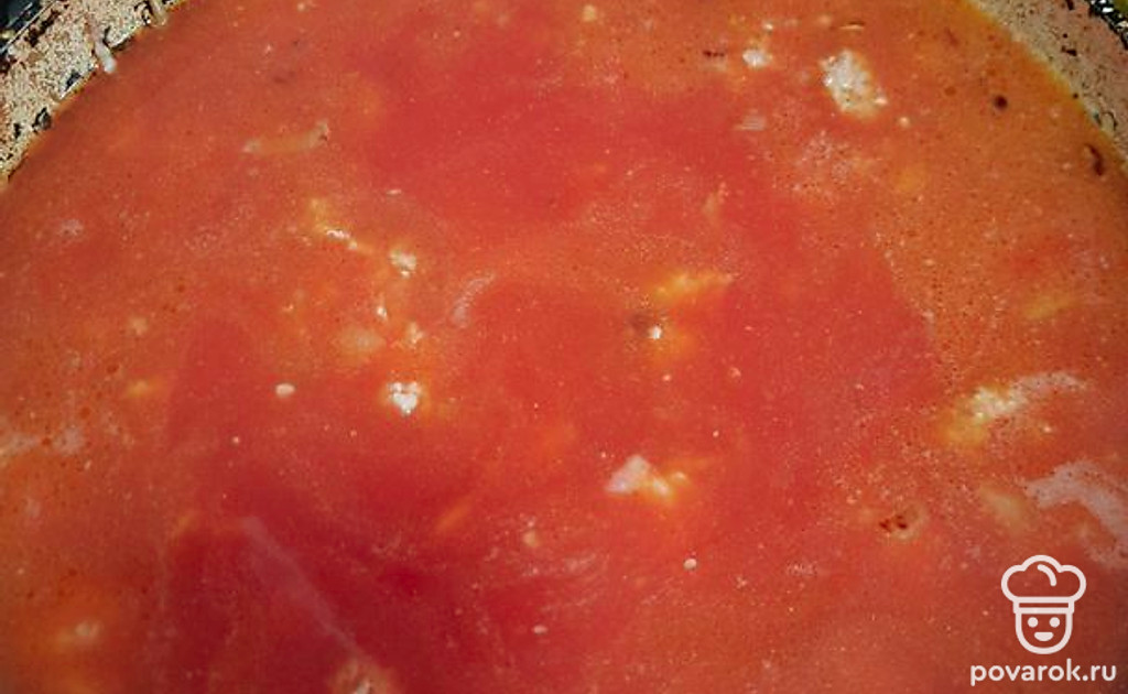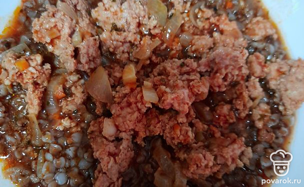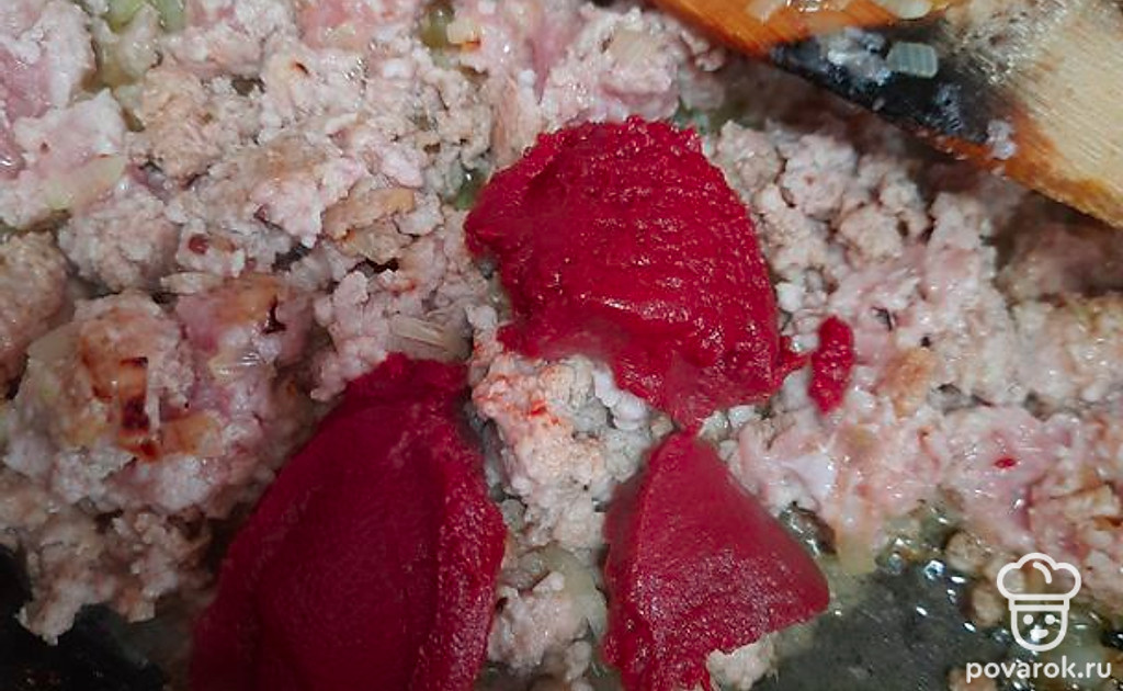 К обжаренному фаршу и луку добавить томатную пасту, перемешать.