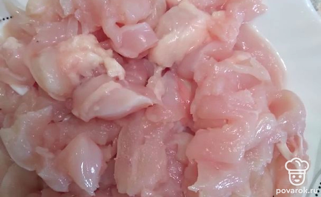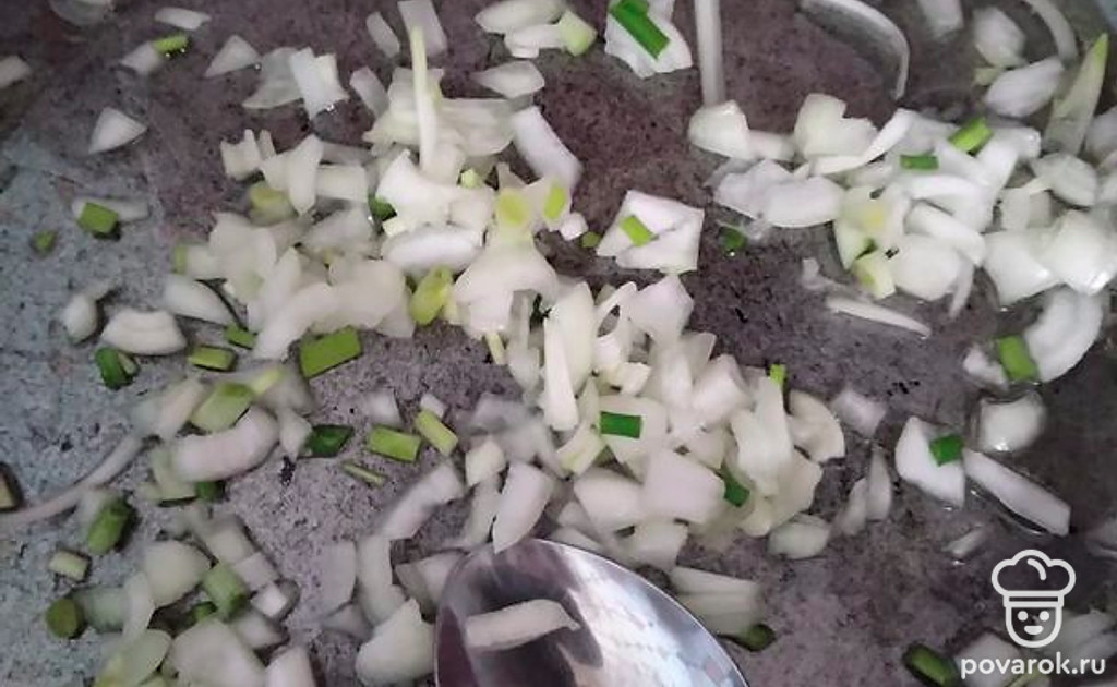 Лук нарезать кубиками, выложить на подогретую сковородку и обжарить.