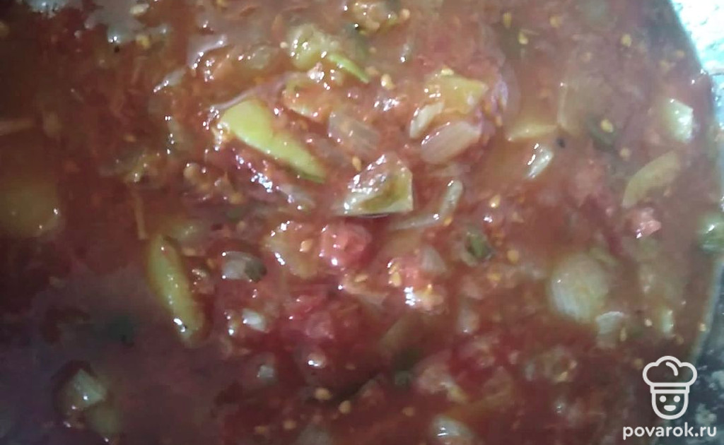 Смешать грудинку с луком, добавить томатную пасту и приправы. Обжарить несколько минут. Добавить 3 стакана кипятка и варить до готовности.