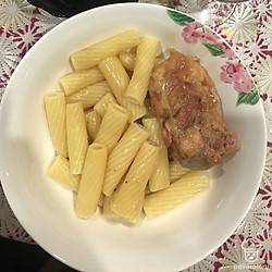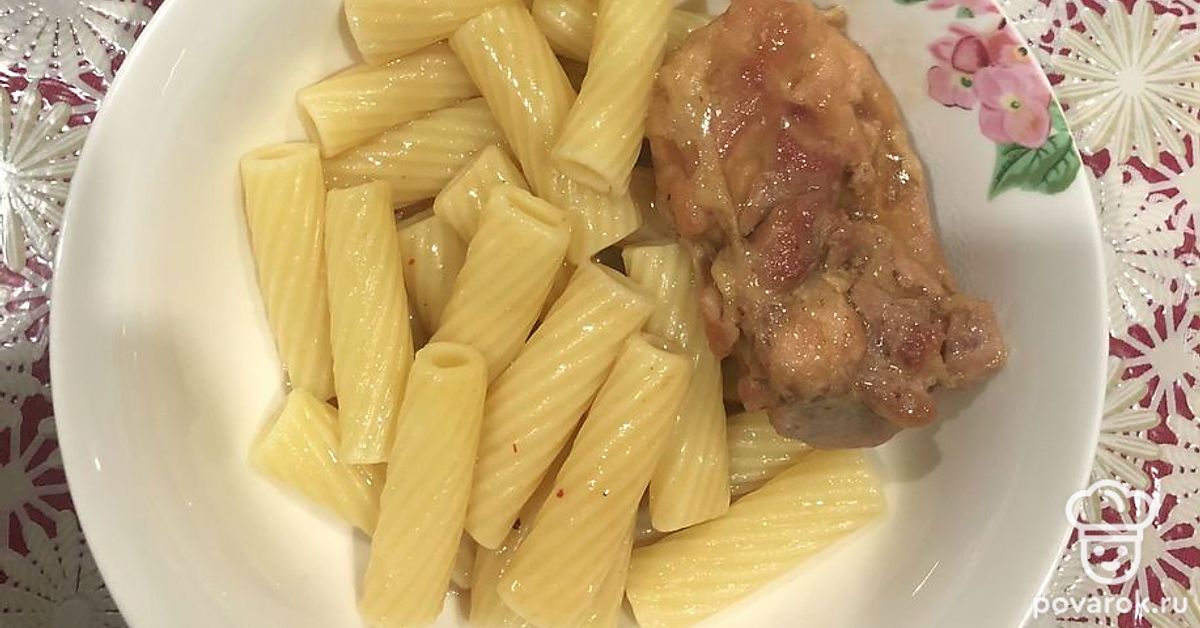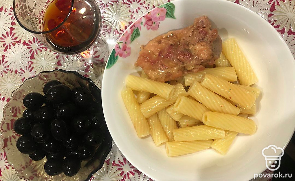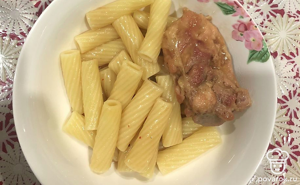 Подавайте с любимым гарниром, у меня крупные макароны-трубочки.