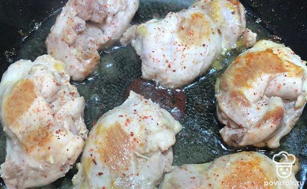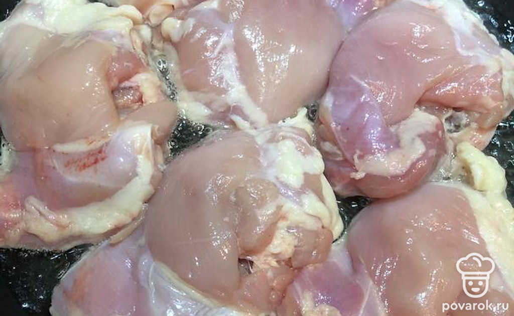 Филе бедра курицы выложите на разогретую сковороду с подсолнечным маслом.