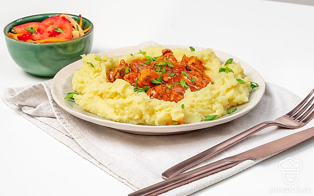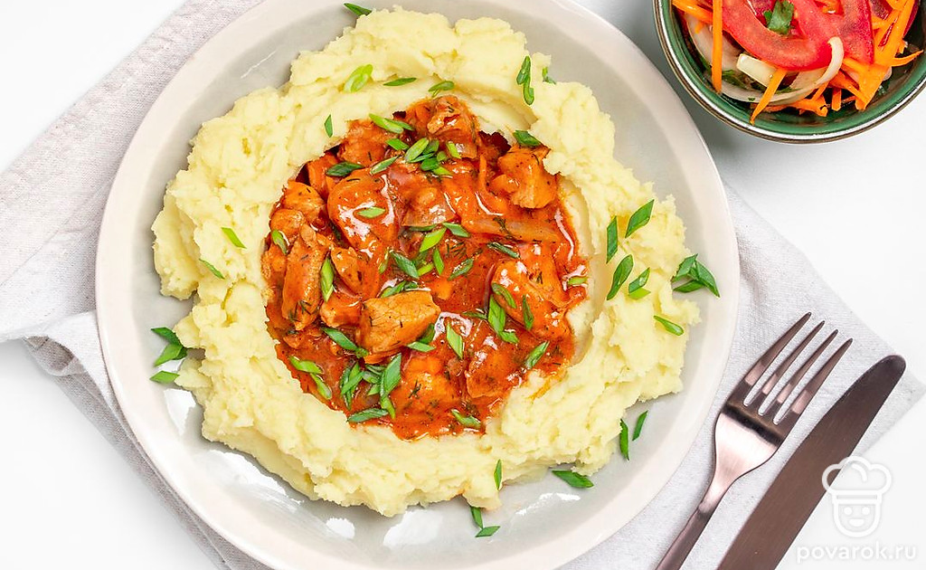 Чтобы подливка из свинины получилась по-настоящему вкусной, нужно выбирать мясо с небольшим количеством жира. Например, хорошо подойдет лопатка. Кусок нужно хорошенько промыть холодной водой и тщательно обсушить бумажными полотенцами. Сухое мясо при обжаривании на раскаленном масле не выпустит сок, и он весь останется в кусочках. Свинину лучше всего нарезать мелкими брусочками поперек волокон. В этом случае мясо получится нежным и очень сочным.