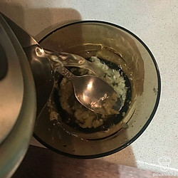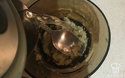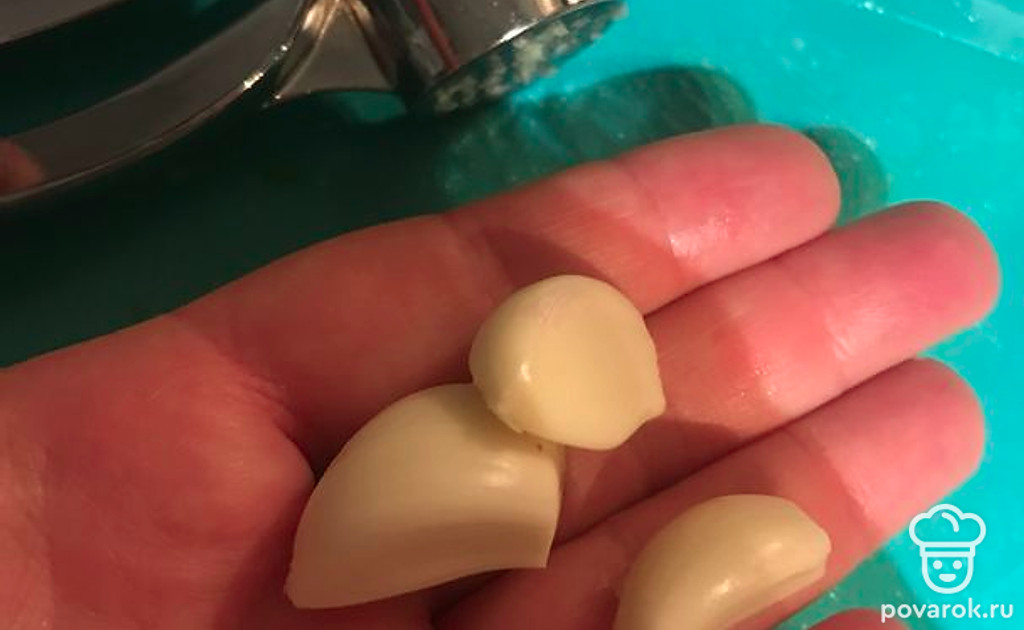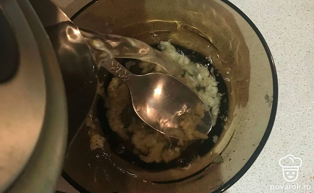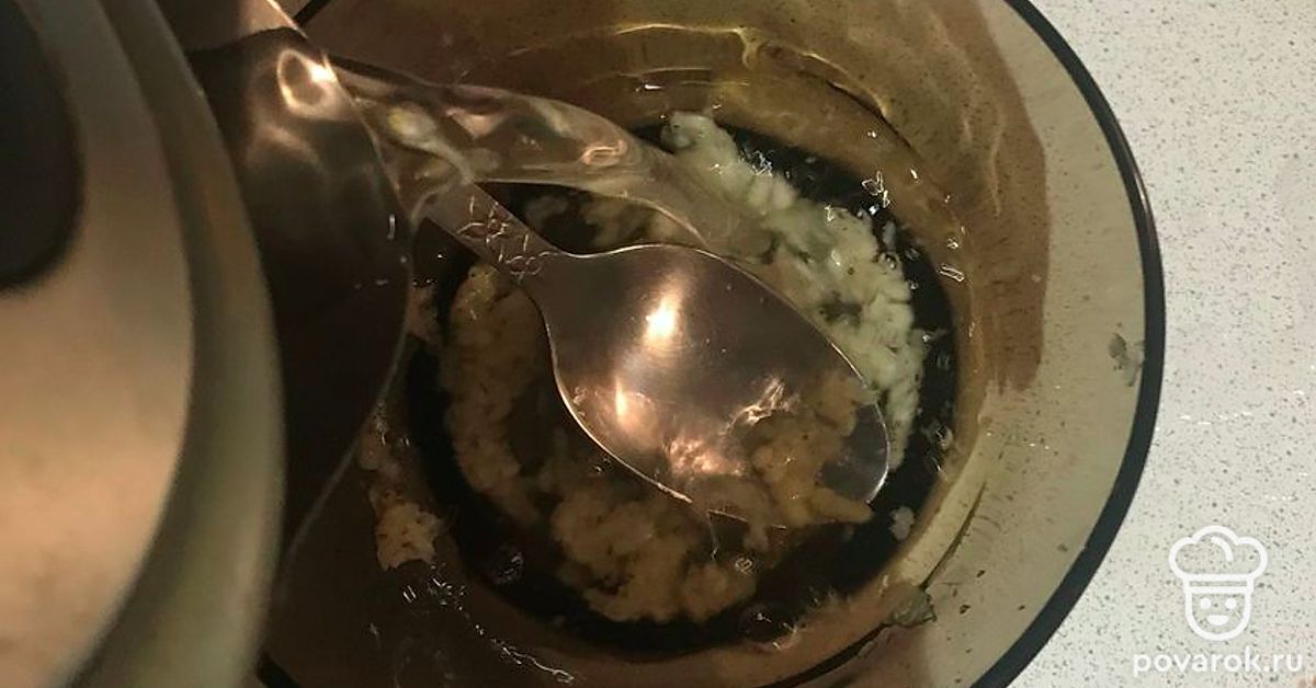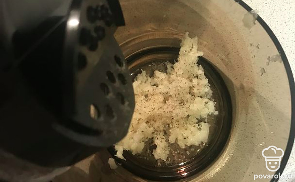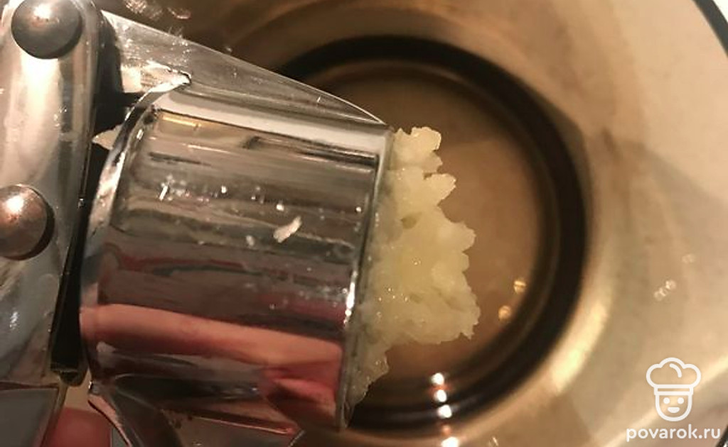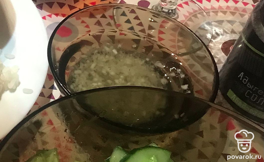Добавьте немного соли (лучше душистой, но можно и простой). Перемешайте и оставьте на 5 минут, чтобы чеснок дал сок.