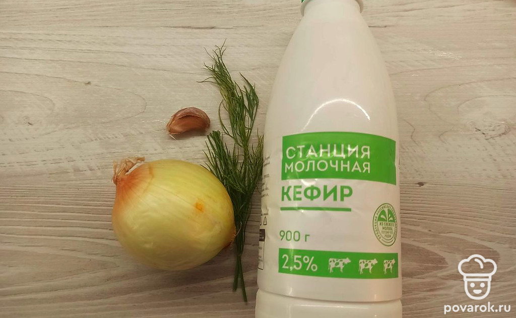 Влейте кефир, посолите по вкусу и пробейте блендером до однородной массы в течение 2 минут.
