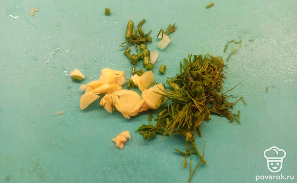Укроп нашинкуйте, чеснок нарежьте кусочками.