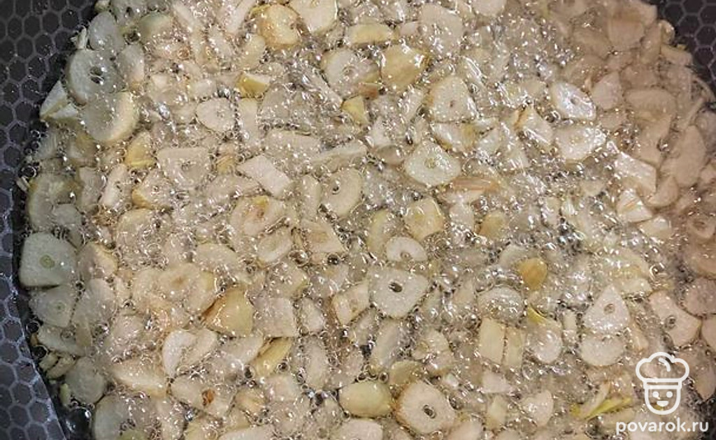В горячее масло добавляем чеснок, через минуты 2-3 солим, добавляем розмарин. Чеснок должен быть мягкий и не зажаристый, готовим на среднем огне.