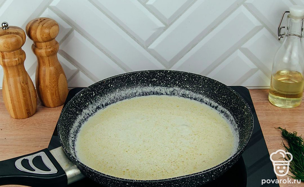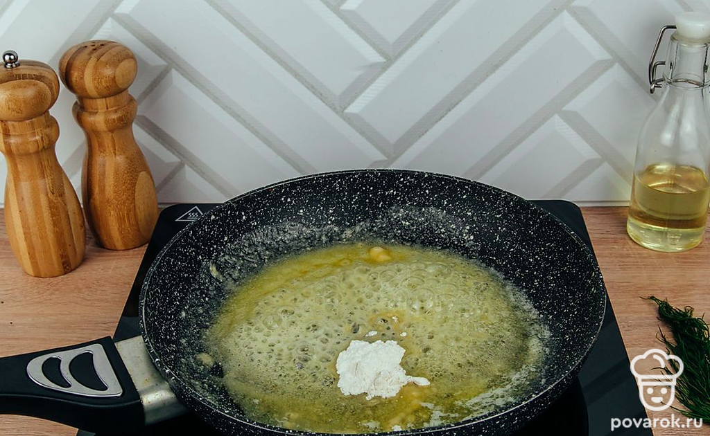 Растопите сливочное масло на сковороде с добавлением небольшого количества растительного масла. Добавьте муку.