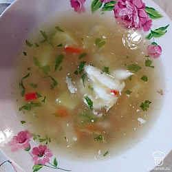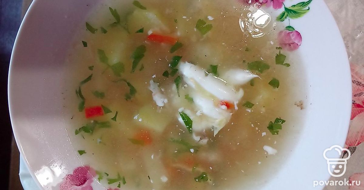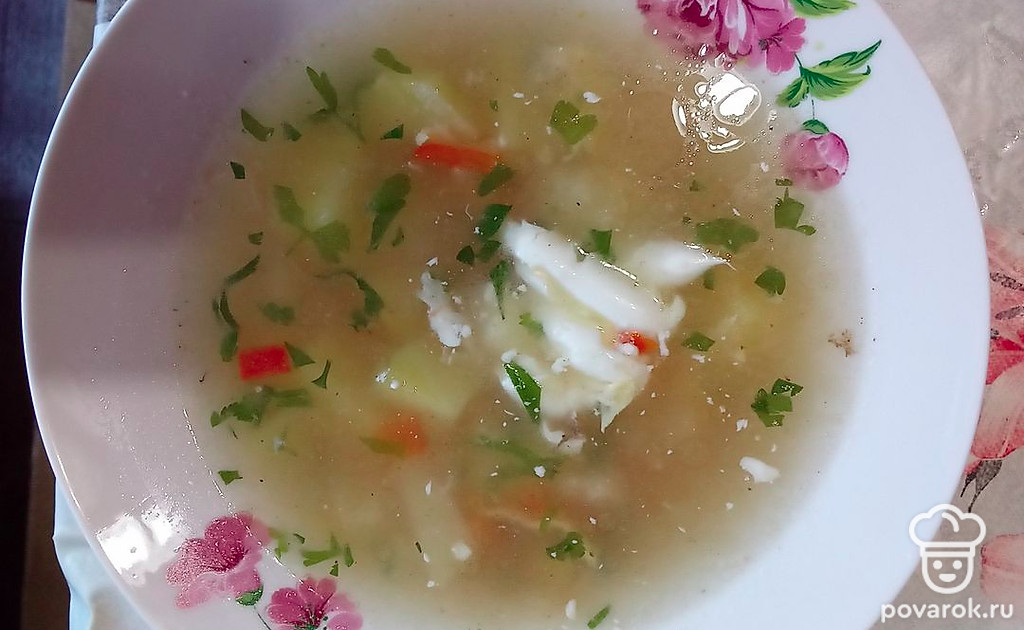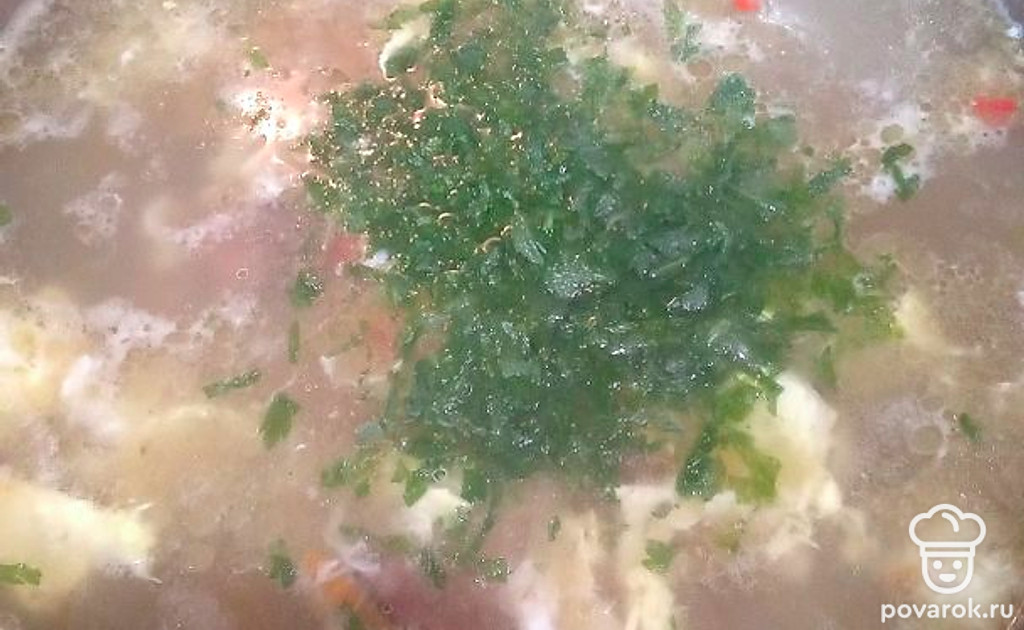 Мясо сварилось, теперь можно добавлять картошку. Через 3 минуты добавляем рис. Далее кладем готовую приправу. Она состоит из 1 лука, 1 моркови, болгарского перца, 200 мл томатного сока. Варим суп до готовности картошки. Посыпаем зеленью.