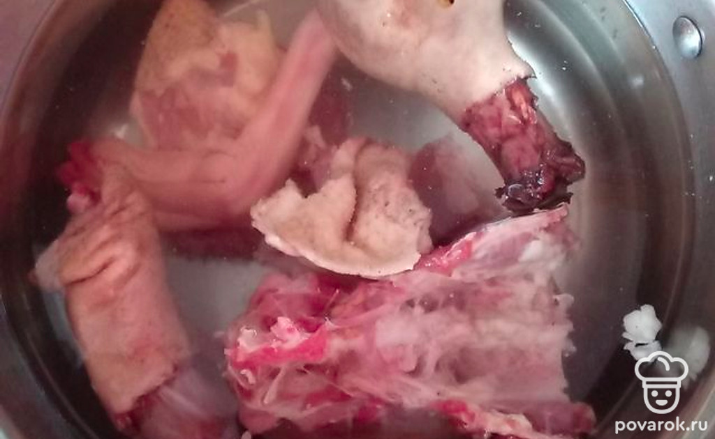 В кастрюле вирим мясо гуся на среднем огне полтора часа. Добавляем щепотку соли.