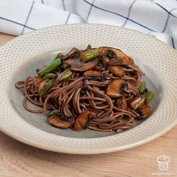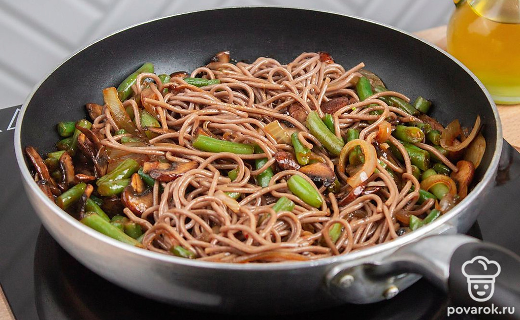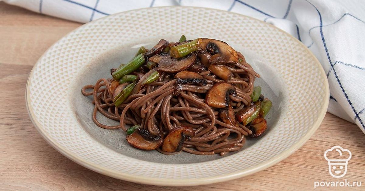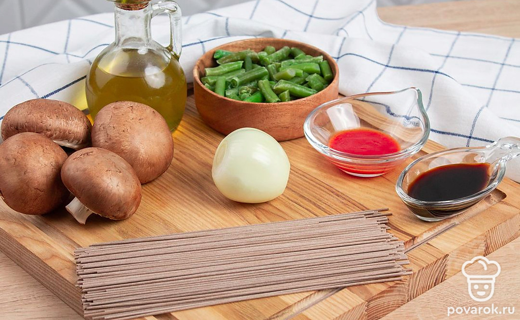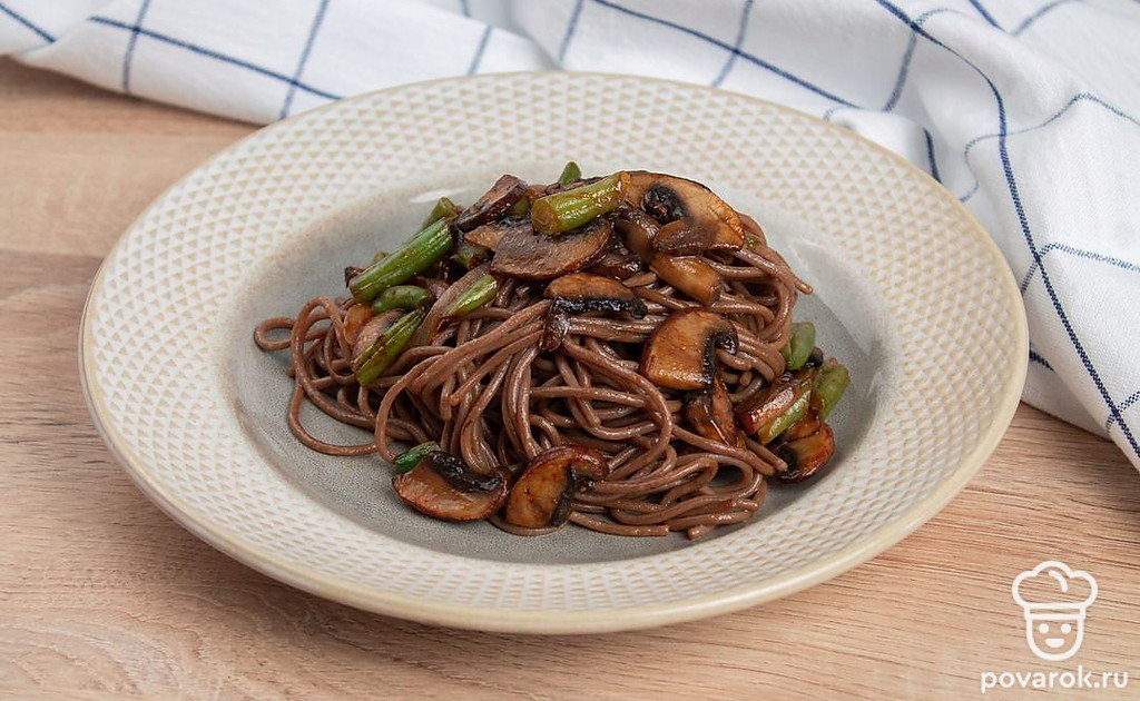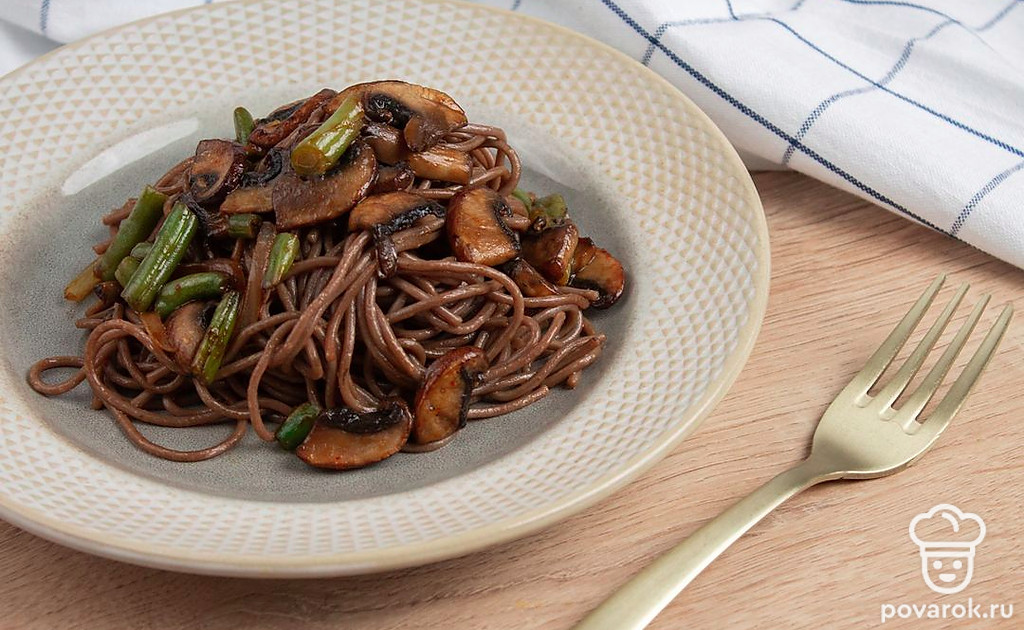 Соба с королевскими шампиньонами, фасолью и соусом шрирача