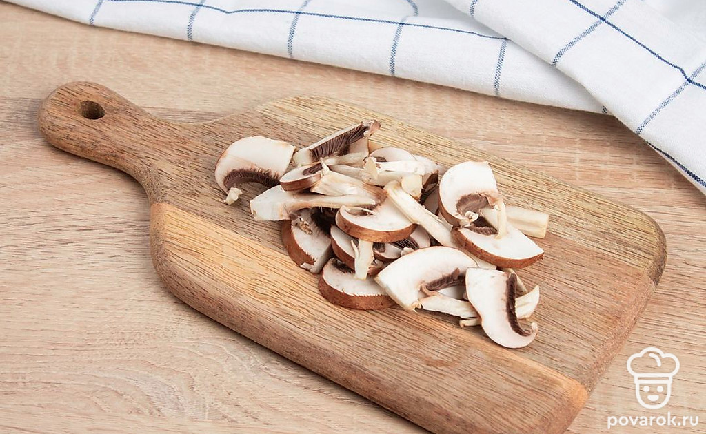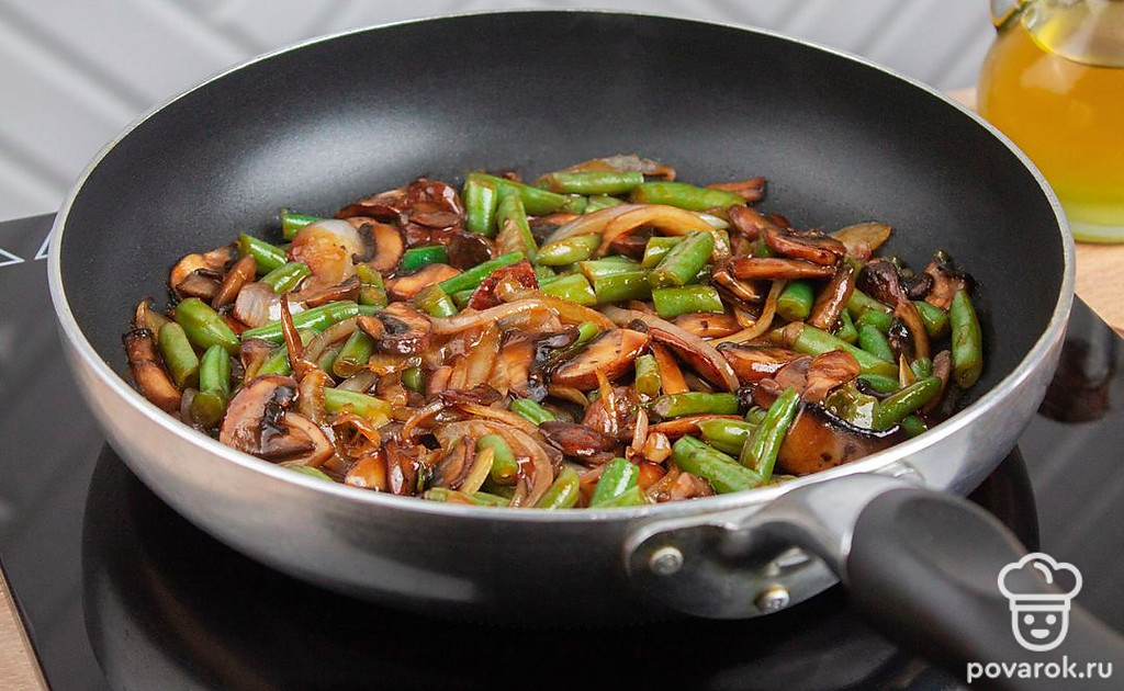 Очистите луковицу от шелухи. Промойте грибы под холодной водой. Разморозьте зеленую фасоль.