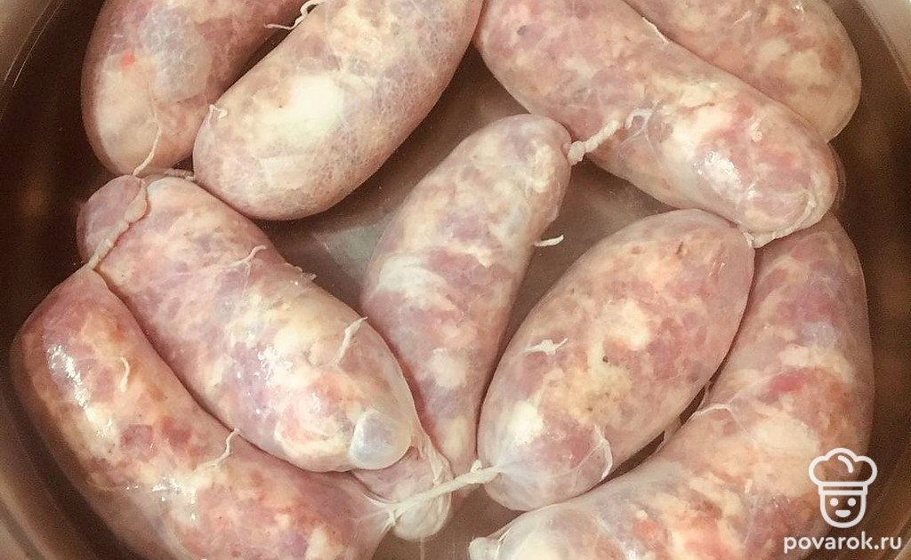 Наберите пол кастрюли воды. Положите в нее купаты. Оставьте вариться 4-5 минут. Очень важно — не протыкайте купаты во время варки.