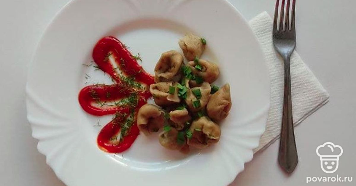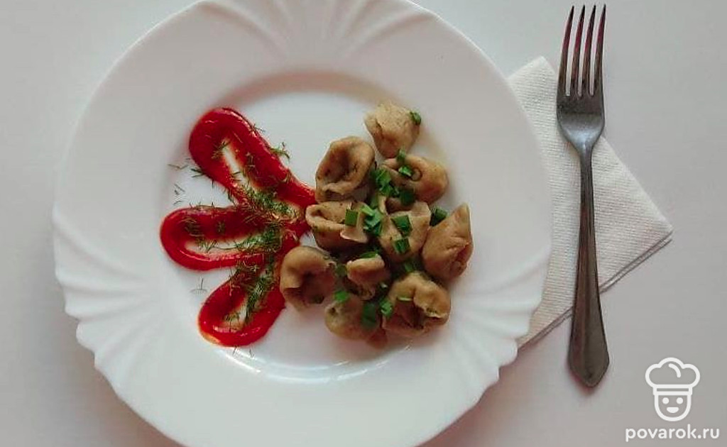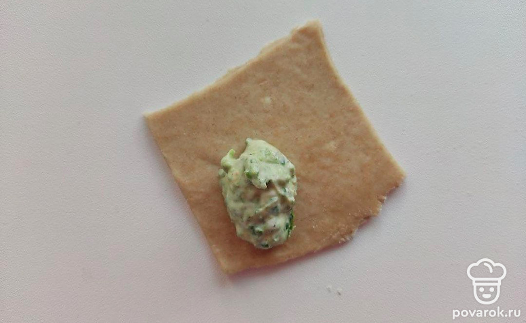 Подготовленное тесто раскатайте в пласт толщиной 1 сантиметр, нарежьте квадратиками 5х5 сантиметров, на готовые квадраты выложите по чайной ложке начинки, сложите в треугольник, после чего согните верхний уголочек и соедините между собой два оставшихся угла. Варите в подсоленной воде 5-7 минут.