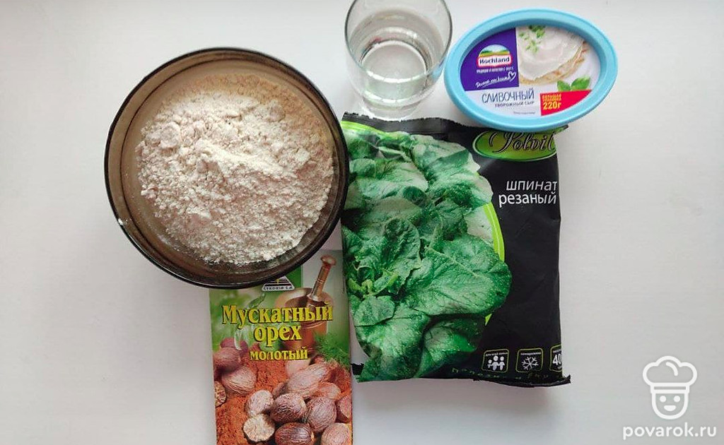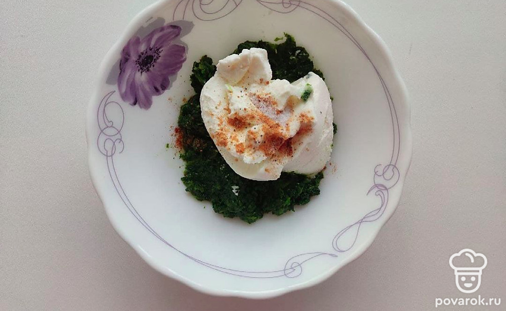 В сотейник с небольшим количеством кипящей воды добавьте шпинат и тушите 3 минуты. Шпинат должен приобрести консистенцию пюре. Для приготовления начинки смешайте в однородную массу творожный сыр, шпинат, соль и мускатный орех.