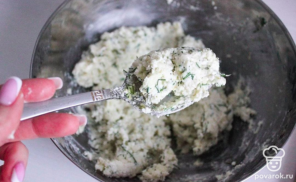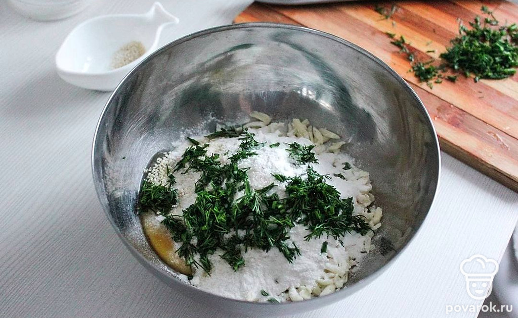 В миске смешайте творог, натертый сыр, яйцо, муку, разрыхлитель, соль, немного кунжута (1-2 ч. л.) и рубленую зелень.