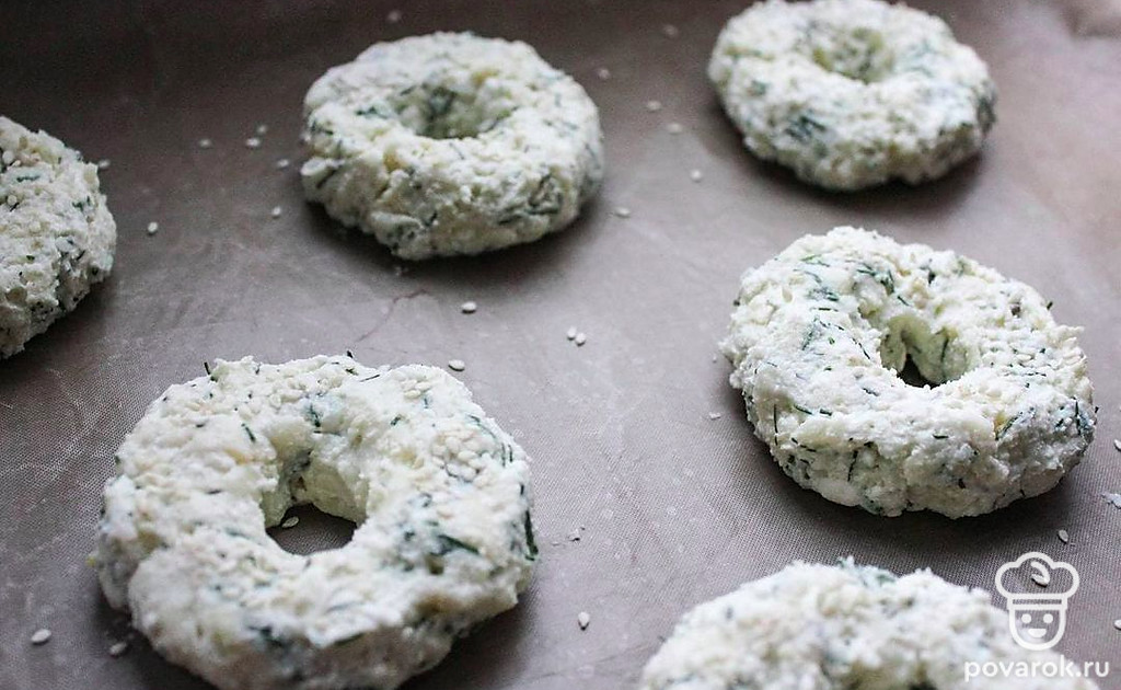 Перемешайте до однородной липкой массы. Руками сформируйте бублики, выложите их на противень, застеленный пергаментной бумагой или силиконовым ковриком. Сверху посыпьте бублики кунжутом.