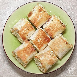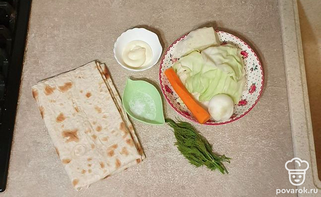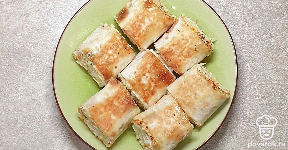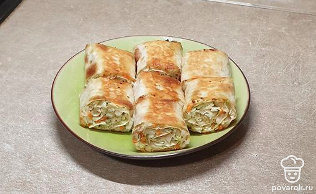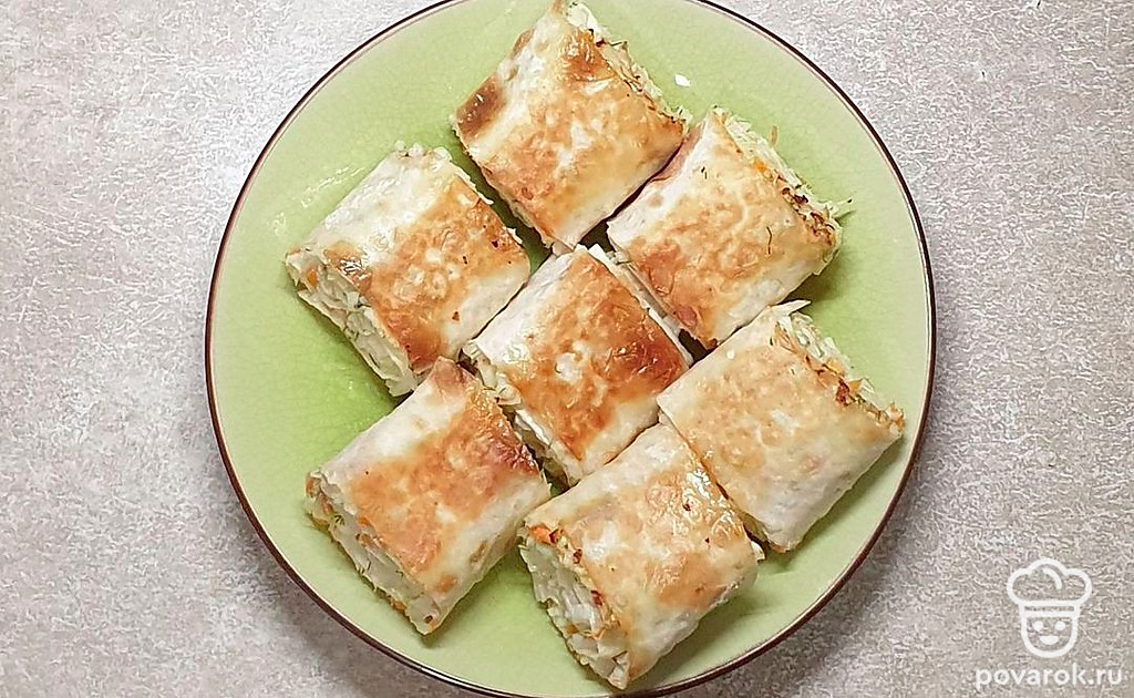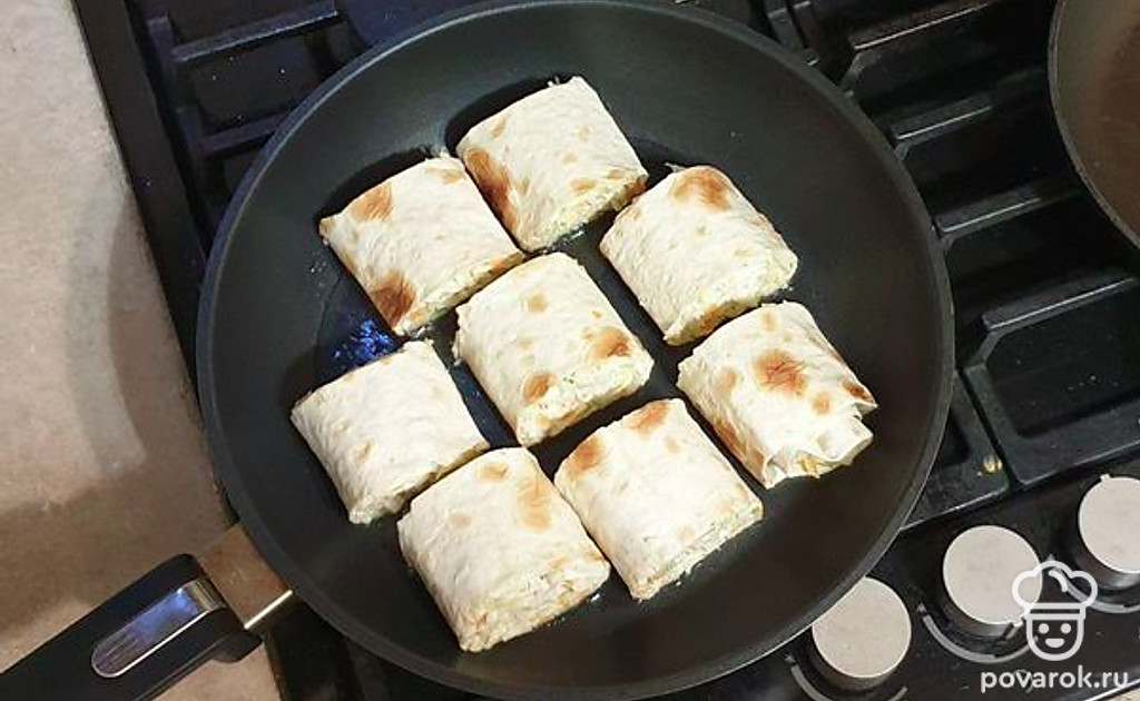 Лаваш аккуратно сверните в рулет. Рулет нарежьте на равные кусочки и выложите на разогретую сковороду. Жарьте на небольшом огне до золотистой корочки с каждой стороны.