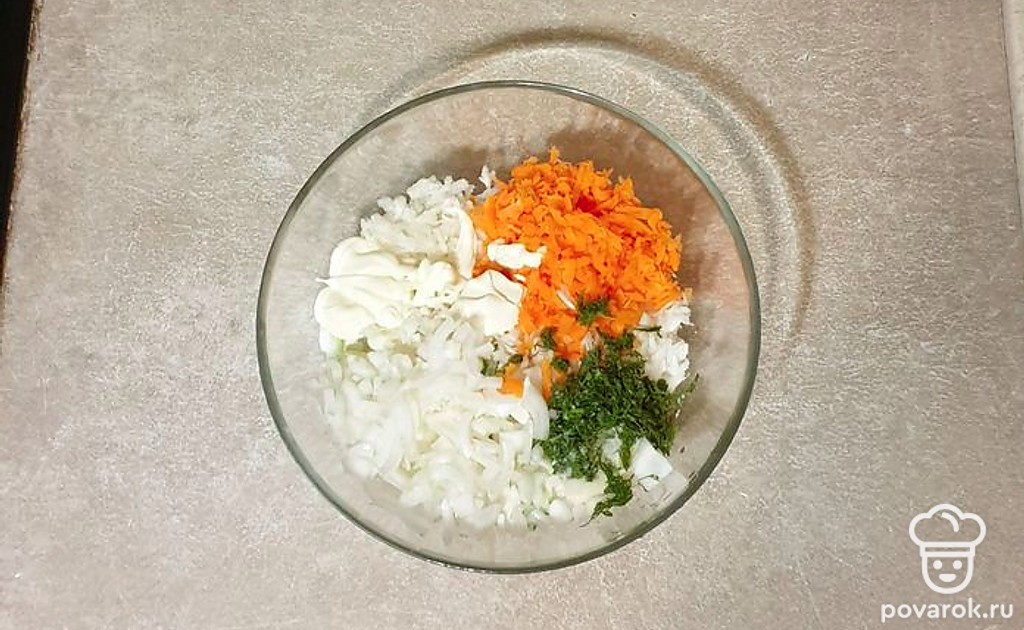 В миске соедините лук, морковь, капусту. Добавьте мелко нарезанный укроп, майонез и соль. Хорошо перемешайте.