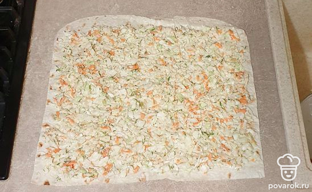 На лист лаваша выложите всю начинку. Распределите тонким слоем.