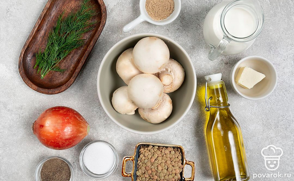 Промойте чечевицу холодной водой. Вымойте и обсушите шампиньоны и зелень. Ополосните и почистите лук. Подготовьте кастрюлю, сковороду и погружной блендер.