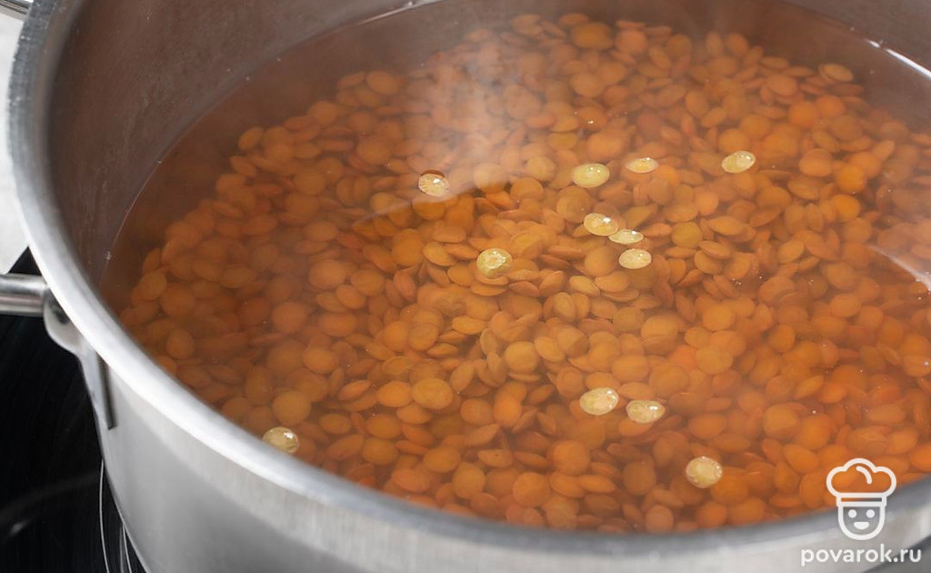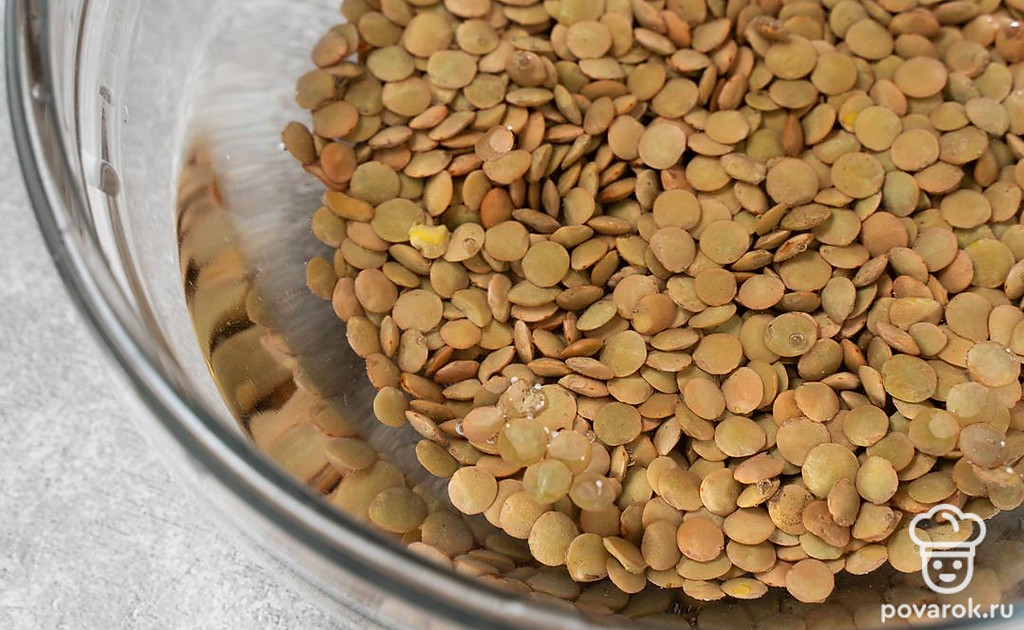 Выложите чечевицу в глубокую миску. Залейте ее водой и оставьте на 10-12 часов. После этого хорошенько промойте.