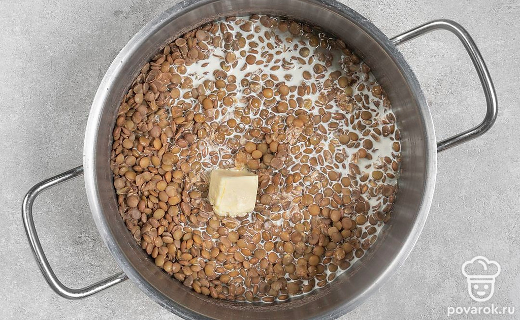 Добавьте к чечевице молоко и сливочное масло. Пробейте ингредиенты блендером до однородности.