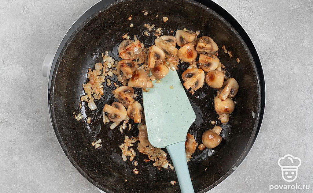 Добавьте к луку нарезанные дольками грибы. Тушите их, периодически помешивая, 10 минут. После этого выключите огонь.