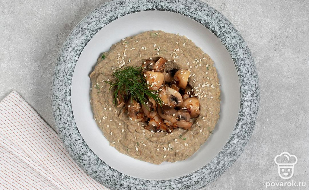 Выложите чечевичное пюре на тарелку. Сверху положите обжаренные грибы с луком.