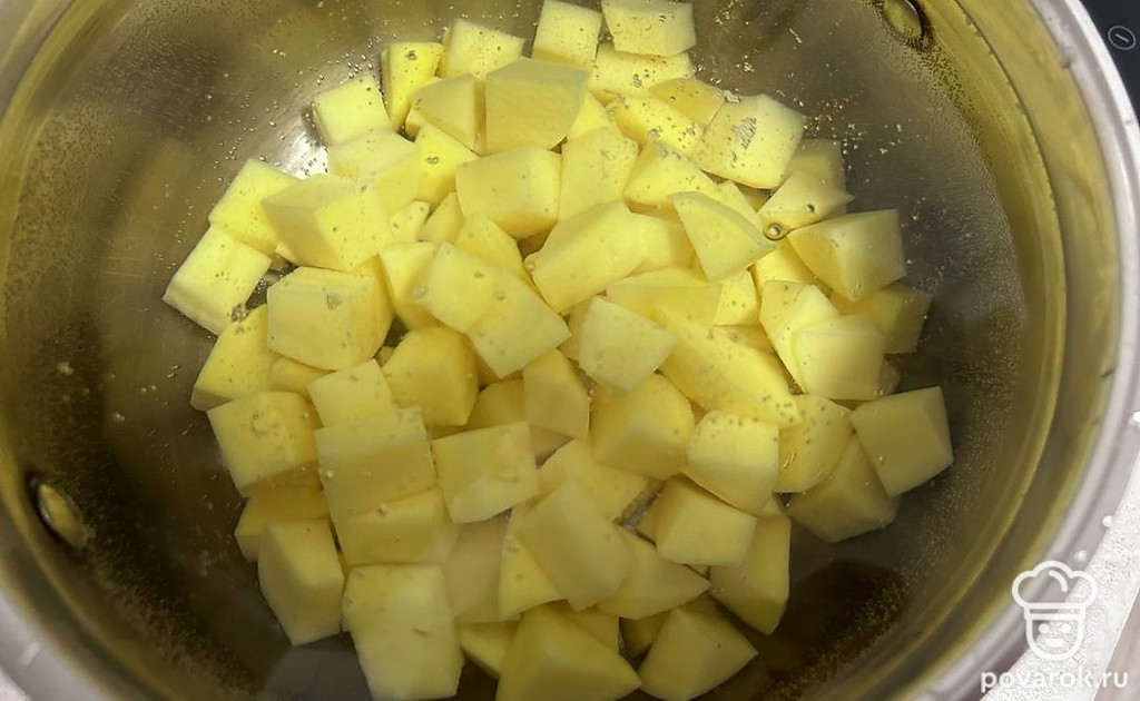 Картошку нарежьте кубиком. Залейте 1,5 литрами холодной воды. Доведите до кипения.