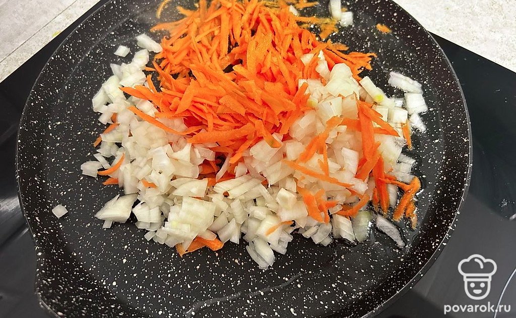 Морковь натрите на крупной терке, лук нарежьте кубиком. Обжаривайте на подсолнечном масле в течение 5 минут.