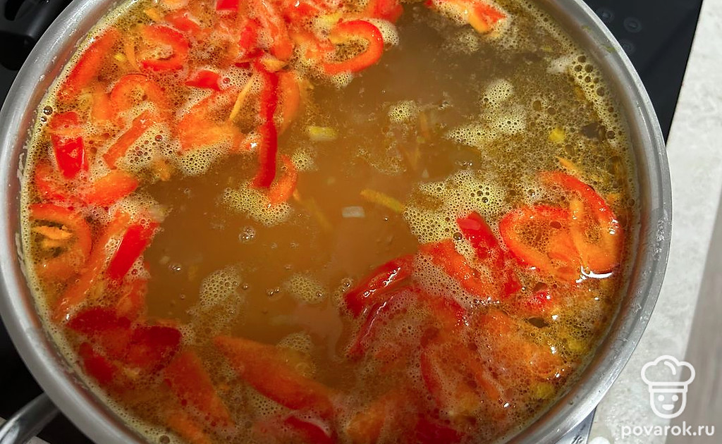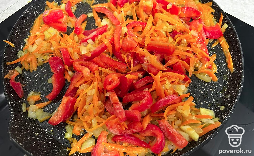 Добавьте нарезанный брусочками перец. Обжаривайте еще 5 минут.
