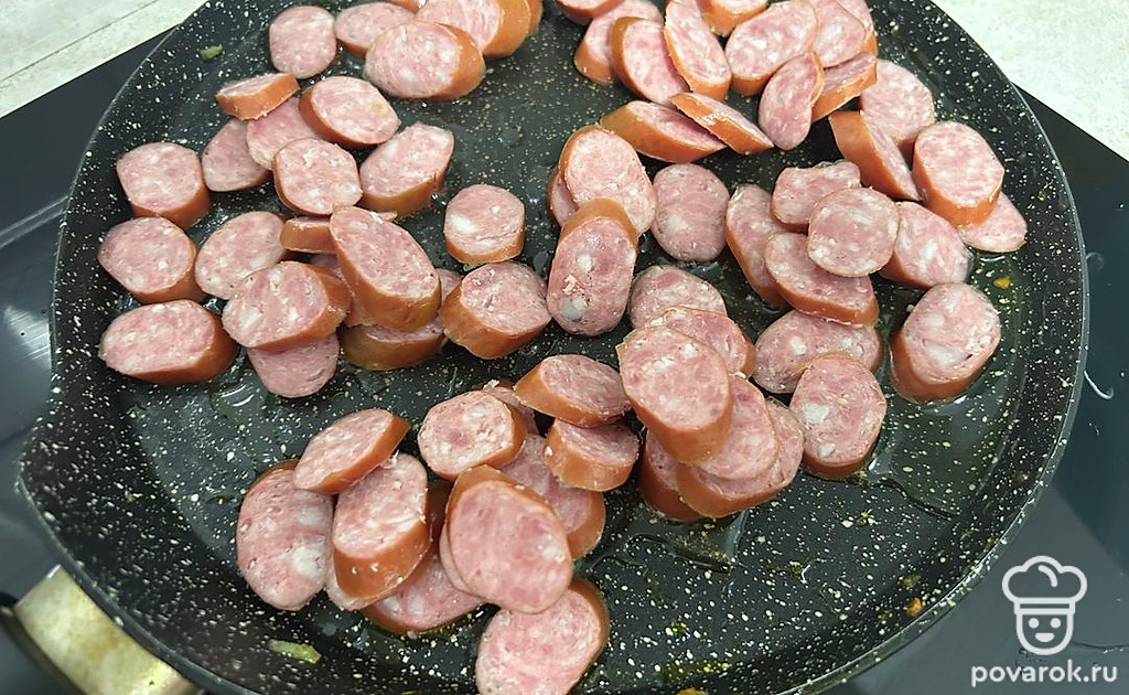 Охотничьи колбаски нарежьте кружками. Обжаривайте в течение 5-7 минут.