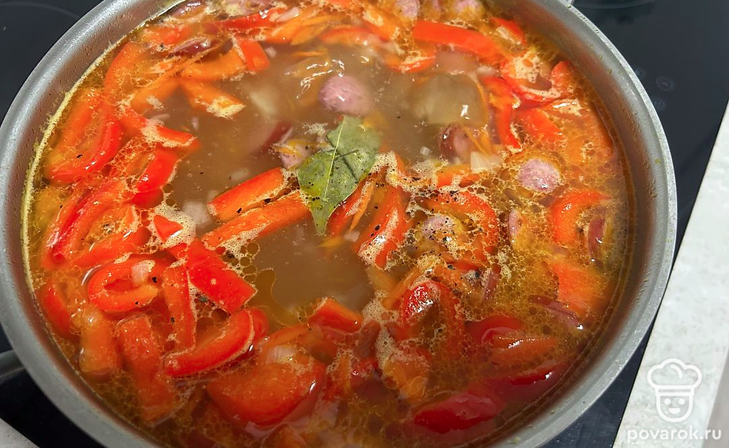 Колбаски добавьте в кастрюлю. Посолите и поперчите по вкусу, добавьте лавровый лист. Варите в течение 10 минут.