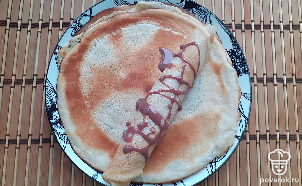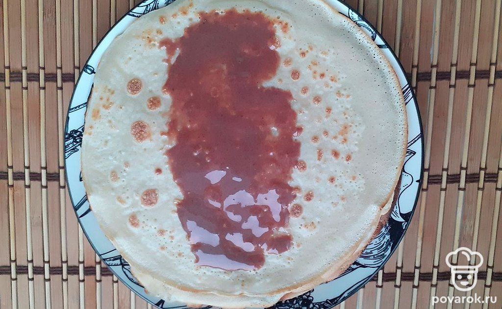 Готовые блины смажьте сгущенным молоком. Скрутите в трубочку.