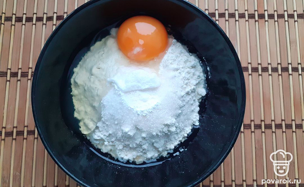 Смешайте муку, разрыхлитель, соль, сахар и яйцо.