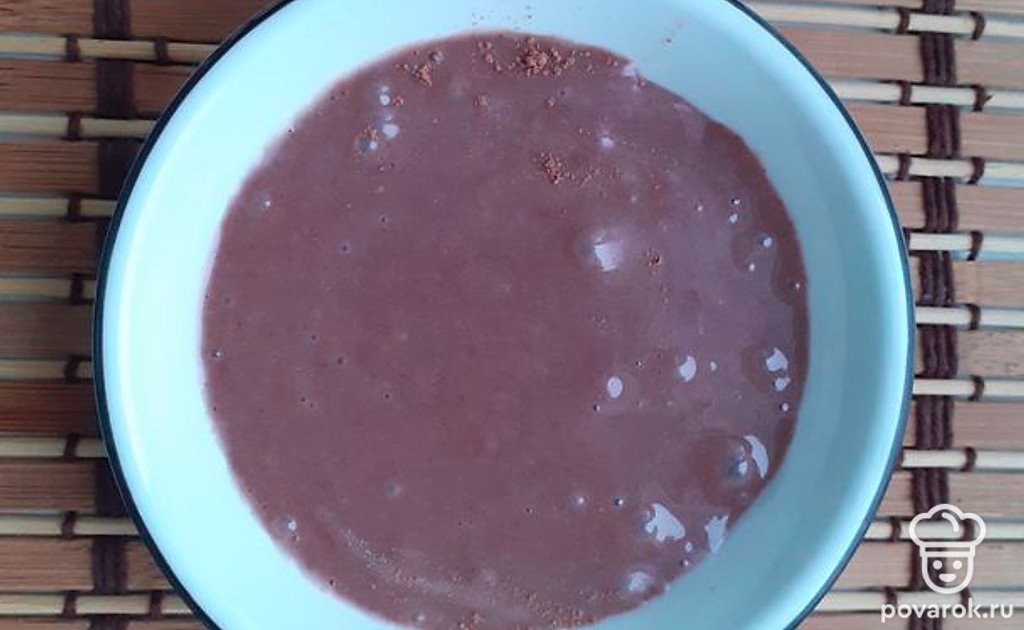 Пока блины жарятся, сделайте шоколадную сгущенку. Смешайте какао со сгущенным молоком.