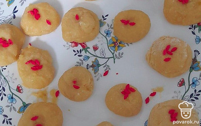 Далее постепенно добавляйте муку. Всыпьте 5 ложек, перемешайте. Дальше размешивайте руками. Скатайте тесто в колбаску и разделите на 10-8 частей. Из каждой части сформируйте шарик. Переложите на тарелку и добавьте посыпку.