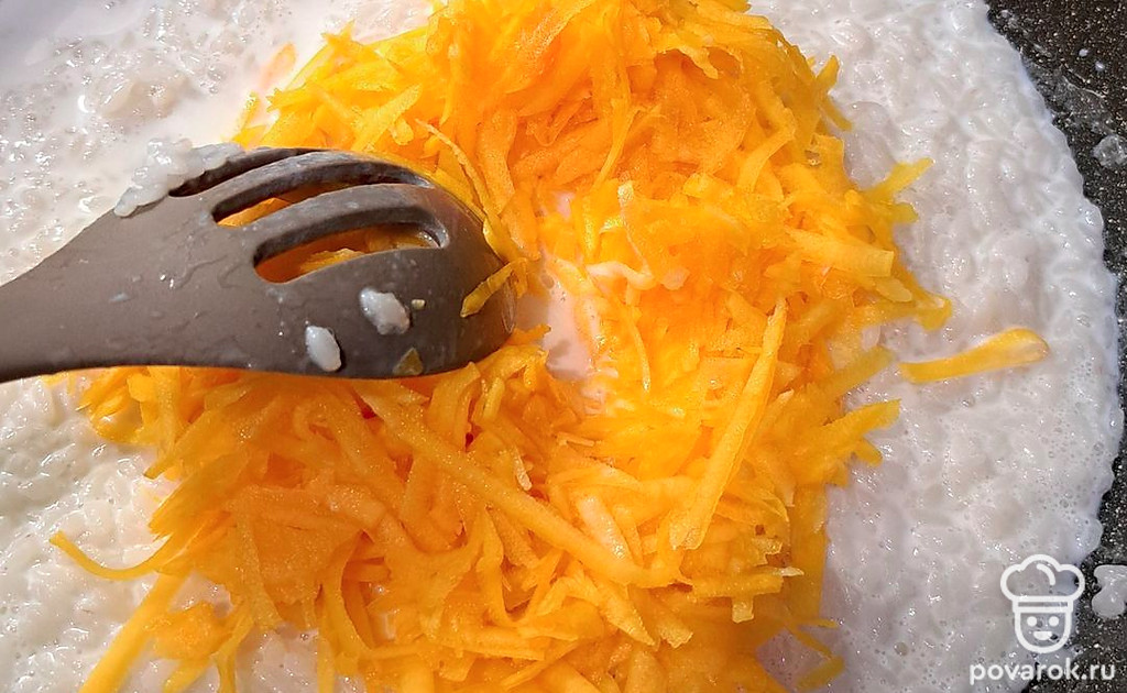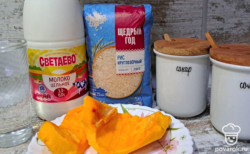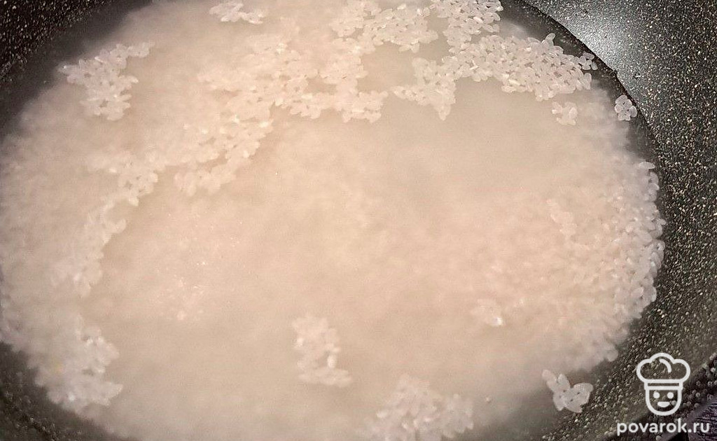 350 грамм риса всыпьте в посуду, в которой будет вариться каша. Залейте 500 миллилитрами воды. Оставьте вариться под крышкой до полуготовности.