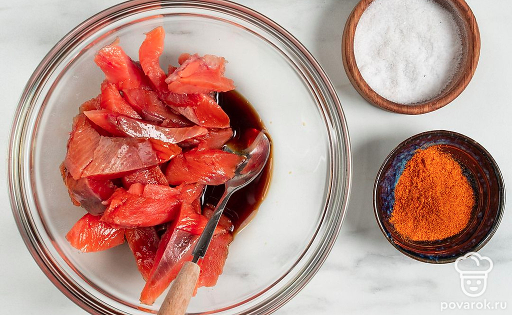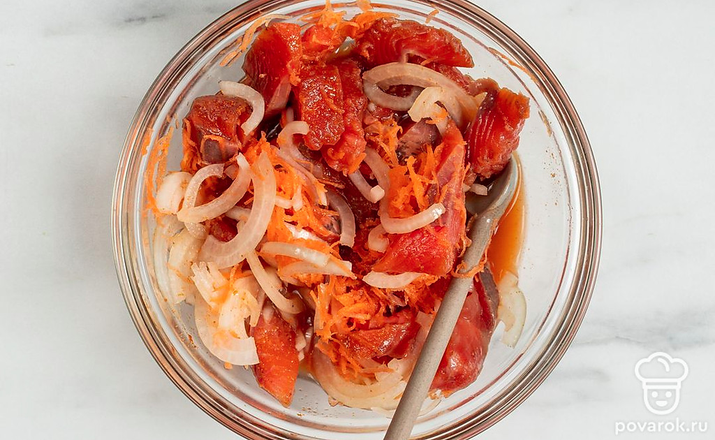 Классическую корейскую закуску хе можно готовить практически из любой рыбы. Одинаково хорошо она получается как из белой рыбы, так и красной. В этом рецепте мы отдали предпочтение второму варианту и приготовили хе из горбуши. Готовая закуска получилась очень вкусной и ароматной. Для разнообразия мы добавили в хе немного лука, но вы можете поэкспериментировать и взять другие овощи тоже. Хорошо подойдет морковь и чеснок.