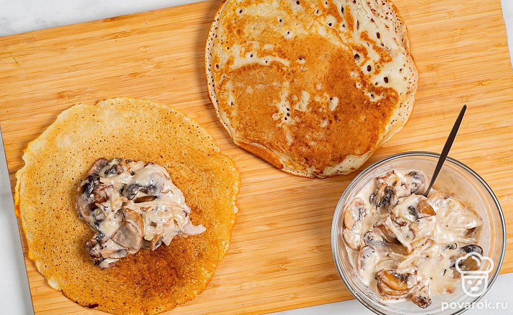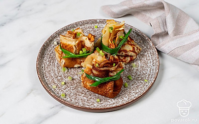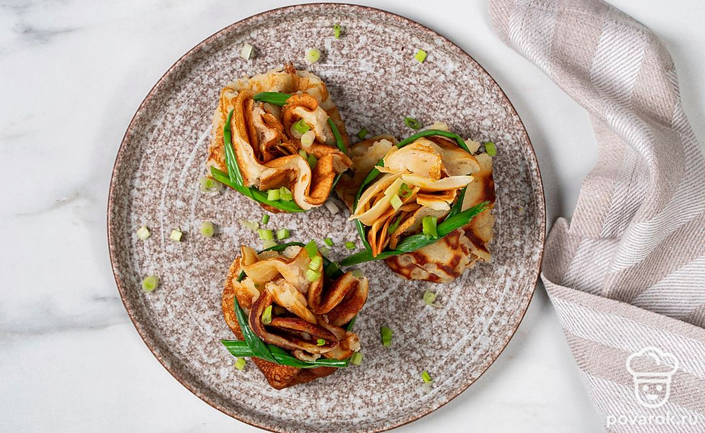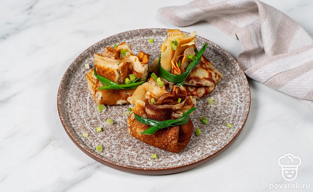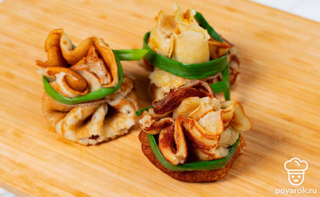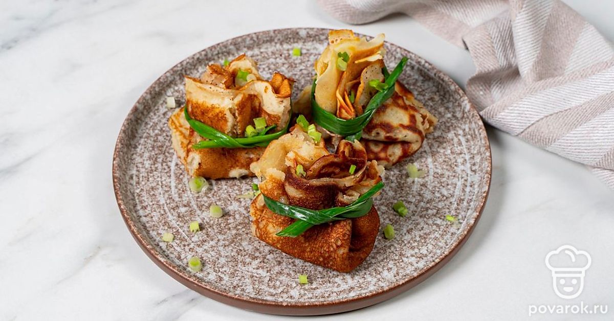 Мы приготовили очень вкусную и оригинальную закуску, которая хорошо подойдет и для сытного перекуса. За основу мы взяли блины, а в качестве начинки выбрали грибы, лук и тертый сыр. Грибы для блюда можно выбрать любые. Мы взяли шампиньоны, но также хорошо подойдут вешенки или лисички. Чтобы закуска держала форму и не разворачивалась, обязательно соедините ее пером зеленого лука. Если его нет, можно взять и другую зелень.